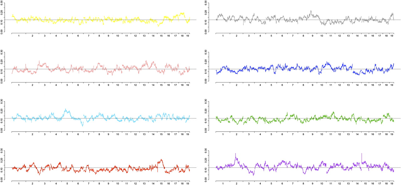 Allele frequencies. Genome-wide founder allele frequencies range from 4.1% to 27.3%. The color corresponding to each founder strain is the same as in Figure 1D.