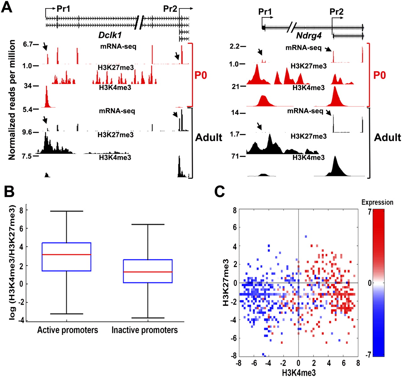 Distinct histone modification profile of active and inactive promoters and their role in alternative promoter selection during development. (A) Wiggle profiles of mRNA expression and H3K4me3, H3K27me3 modifications on the alternative promoters of Dclk1 and Ndrg4 in P0 (red) and adult (black) cerebella. The arrows point to either the expression of AFE or the enrichment of H3K4me3 and H3K27me3 at the alternative promoters. The loss of transcript expression from promoter (Pr) 1 for Dclk1and Ndgr4 in adult cerebellum is marked by reduced/loss of H3K4me3 and highly enriched H3K27me3. In contrast, the increase in expression from Pr2 parallels high H3K4me3 and loss of H3K27me3. (B) Box plot shows the distribution of relative enrichment of H3K4me3 over H3K27me3 on the active and inactive promoters marked by both marks in P0. (C) Heat map shows the distribution of relative H3K4me3 and H3K27me3 enrichment in log2 scale on the alternative promoters of two promoter genes, where the expression of alternative promoters differs at least twofold. Expression is represented as log2 fold change between alternative promoters of a gene. Red means up-regulation and blue represents down-regulation of expression.