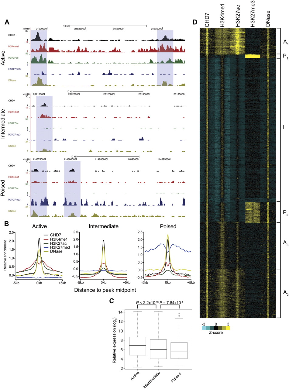Identification of multiple enhancer classes. (A) Example ChIP-seq profiles of each enhancer class in mESCs. Data were visualized using the UCSC Genome Browser. Putative active, intermediate, and poised enhancers are highlighted in blue boxes. (B) Aggregate plots of CHD7, H3K4me1, H3K27ac, H3K27me3, and DNase hypersensitivity signal centered on the CHD7 peak midpoint. (C) Boxplot of expression levels of genes associated with each enhancer class. P-values were calculated by the Wilcoxon rank-sum test. (D) Heatmap of CHD7-bound enhancers generated by k-means cluster analysis. Each window represents signal ±5 kb of the CHD7 peak midpoint. Active clusters are designated A1-3, the intermediate cluster is designated I, and the poised clusters are designated P1-2.