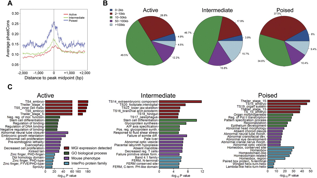 Distinguishing features of enhancer subclasses. (A) Average phastCons plot for each enhancer class in a 4-kb window centered on the CHD7 peak midpoint. (B) Distribution of enhancers in each class relative to known transcription start sites. (C) Results of functional annotation of each enhancer class using GREAT. The −log10 of the binomial test P-value is reported.