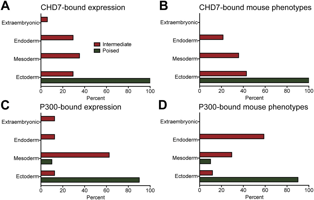 Expression and phenotypic analysis of enhancer-associated genes, correlated with germ layer. The spatiotemporal expression patterns of genes associated with each enhancer class in the developing mouse embryo were determined using GREAT. The germ layer origin of the tissue linked to each annotation was then determined (see Methods). Shown is the percentage of expression annotation terms corresponding to each germ layer, as well as extra-embryonic tissue, for CHD7-bound (A) and P300-bound (C) enhancers. Mouse phenotypes resulting from the mutation of genes associated with each enhancer class were also determined using GREAT. Shown is the percentage of mouse phenotypes, classified by the germ layer of origin of the affected tissue, for CHD7-bound (B) and P300-bound (D) enhancers.