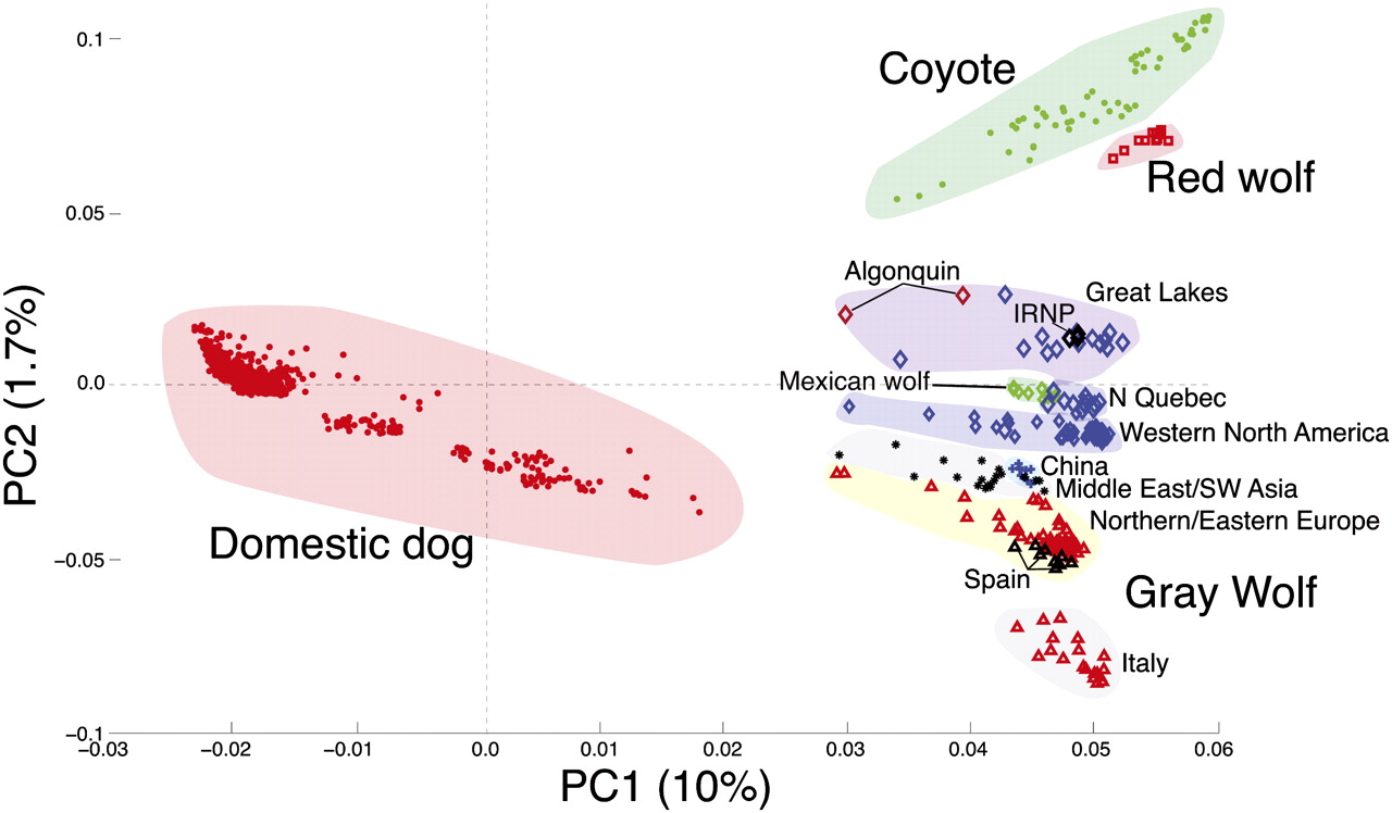 Principal component analysis of all wolf-like canids for the 48K SNP data set (IRNP, Isle Royale National Park).