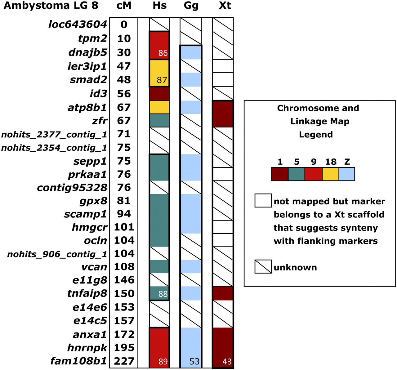 Organization of orthologs among human and chicken chromosomes and Ambystoma mexicanum/A. tigrinum and Xenopus linkage maps. This diagram shows chromosomal rearrangements in the human genome (chromosomes 5, 9, 18) and conservation of genes demarking Ambystoma LG8, chicken Z, and X. tropicalis LG1.