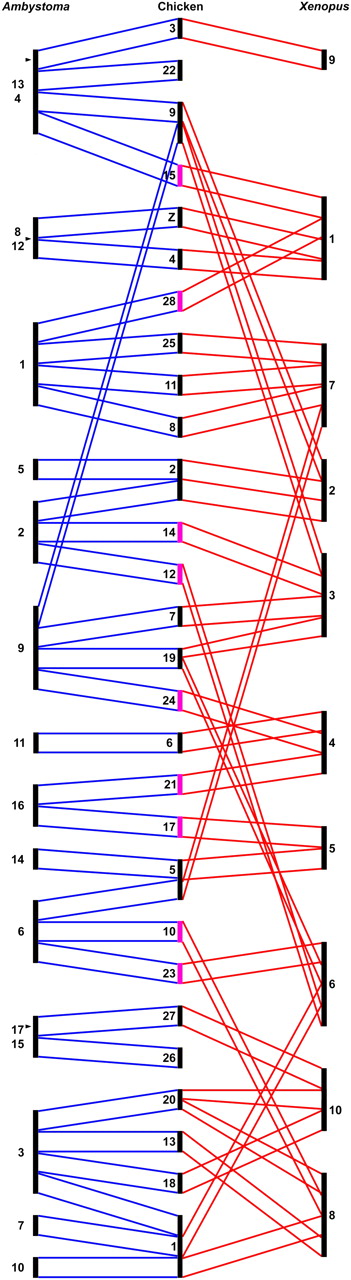 Conserved syntenies among Ambystoma mexicanum/A. tigrinum, chicken, and X. tropicalis genomes. Proposed ancestral chromosomal blocks are delimited by blue lines drawn between Ambystoma and chicken chromosomes. Red lines indicate conserved synteny between chicken chromosomes and X. tropicalis linkage groups. The length of each chromosome corresponds to the number of conserved blocks that are contained within that chromosome. Chicken chromosomes that correspond to blocks that were independently fused in Ambystoma and X. tropicalis are highlighted in pink. Arrowheads mark positions where Ambystoma linkage groups 4–13, 8–12, and 15–17 likely join, based upon previous mapping data (Smith et al. 2005b) and conserved synteny.