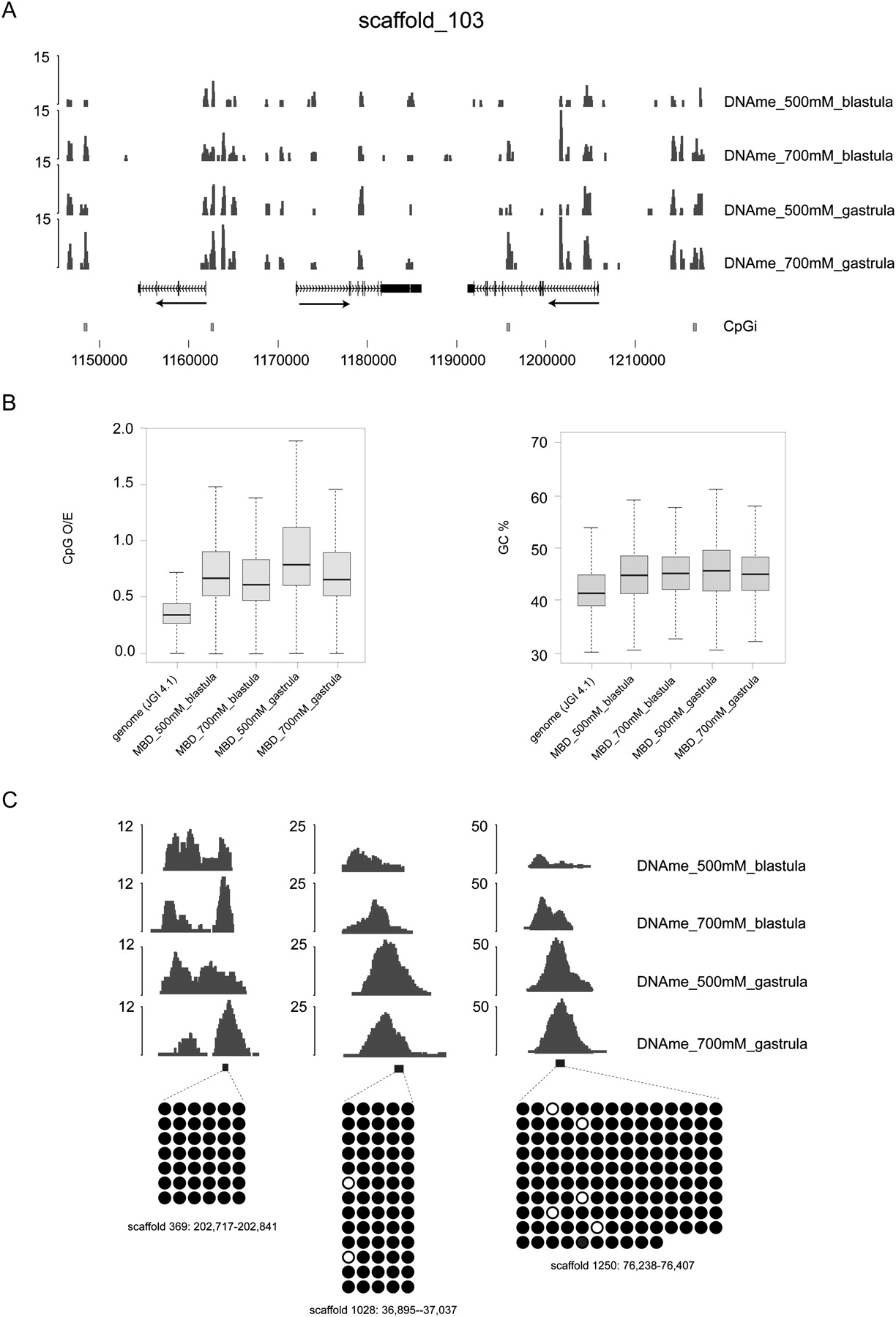 (A) Genome Browser view of sequenced DNA methylation tracks: late blastula (stage 9) and late gastrula (stage 12.5) tracks of both salt elutions (500 mM and 600 mM/700 mM). The X. tropicalis genome is robustly methylated in both intergenic and intragenic regions during blastula and gastrula stages. (B) Boxplots showing the distribution of the CpG observed/expected ratio (CpG O/E) and the GC content (GC%) of DNA methylation peaks. Peaks of DNA methylation are enriched for CpG dinucleotides, whereas their GC content is similar to the genome average. JGI 4.1 refers to the genome assembly used (Joint Genome Institute genome assembly version 4.1). (C) Bisulfite sequencing of randomly selected MethylCap peaks (see also Supplemental Fig. S2B). (Right) Embryonic stages and MethylCap salt elutions of the DNA methylation tracks; (black boxes) PCR amplicons; (below) bisulfite sequencing profiles of the amplicons. (Black circles) Methylated CpGs; (white circles) unmethylated ones.