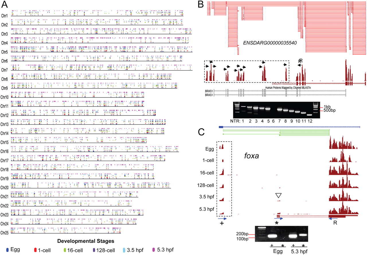 Discovery of NTRs. (A) Genome-wide distribution of NTRs plotted at their mapped chromosomal positions. The color code depicts at which stage an NTR was detected. (B) Novel exons of ENSDARG00000035540, some of which correspond to exons of its human homolog, BRWD1. Splice junctions were also identified among these novel exons. RT-PCR performed using reverse primer at annotated exon 2 (R) and forward primers at each of the 12 NTRs (inset) showed that at least 11 of these NTRs are expressed and are part of the transcription unit. (C) Novel exon in foxa found 5′ of annotated transcription start site. Note the presence of the 5′ annotated exon at 3.5 hpf and 5.3 hpf (white arrowheads). Di-tag (blue horizontal lines) provides support for an isoform that includes the novel exon. Junction mapping at 5.3 hpf (green horizontal lines) indicated the presence of two distinct transcript isoforms. RT-PCR using a reverse primer (R) designed on the 3′ distal exon and forward primers on either 5′ annotated (*) or NTR (+) confirmed the existence of a new 5′ distal exon (inset). The 5′ annotated exon (*) is skipped in the maternal mRNAs (egg to 128-cell stage).