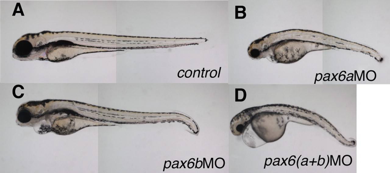 pax6 knockdown in zebrafish results in reduced size, particularly of nervous system structures. (A) Representative control sibling. Knockdown with morpholino oligonucleotides at 1–2-cell stages of (B) pax6a, (C) pax6b, and (D) both pax6a and pax6b genes leading to a phenotype with smaller eyes and reduced central nervous system structures, e.g., neural tube, in comparison to control siblings The abnormal phenotype is present from early stages (24 hpf), and persists long after 48 hpf (B–D). Treated embryos die before day 4.