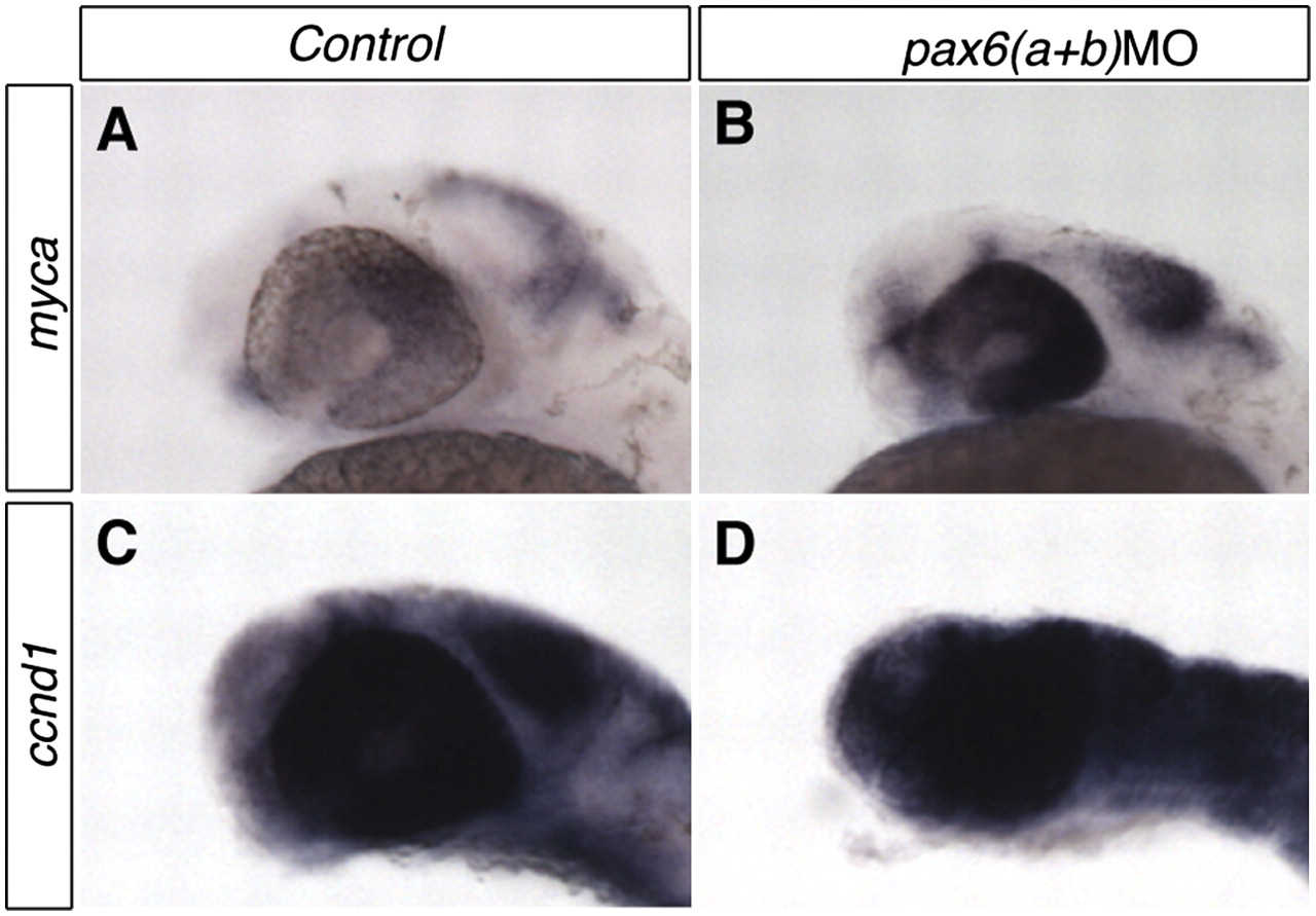 pax6a and pax6b knockdown causes abnormal maintenance of proliferation markers in the eye and CNS. (A,C) Normal expression of the proliferation markers myca and ccnd1 is down-regulated in the eye and CNS by 32 hpf. (B,D) In embryos co-injected with pax6aMO and pax6bMO, abnormal maintenance of expression of both markers is observed.