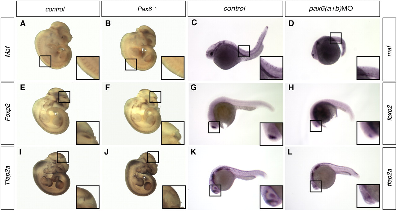 pax6a and pax6b disruption causes similar expression pattern changes in mouse and zebrafish. pax6a and pax6b morpholino knockdown in zebrafish and Pax6 null mutation in the mouse lead to similar disturbance in expression pattern. (A–D) Maf (maf) expression in the neural tube is reduced in both species when Pax6 (pax6a and pax6b) function is disrupted. (E–H) The prominent lateral telencephalon expression domain of Foxp2 (foxp2) is severely reduced. (I–L) Tfap2a (tfpa2) expression in prosomere 1 is abolished.