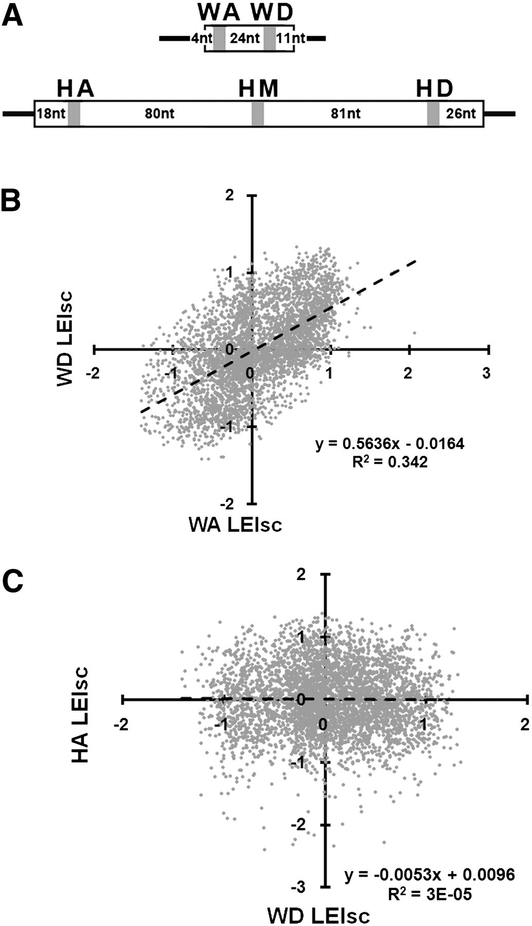 Examples of the effect of location on the splicing behavior of substituted pre-mRNA molecules. (A) The five locations in exons WT1-5 (top, 51 nt) and Hb2 (bottom, 223 nt). (B) The best correlation of the effect of 6-mer substitutions (LEIsc, log of the enrichment index, scaled) was between the WA and WD locations (R2 = 0.34). (C) The worst correlation was between WD and HA (R2 = 3 × 10−5). The dashed line is the least squares regression fit. The results for all five locations are shown in Supplemental Figure 1.