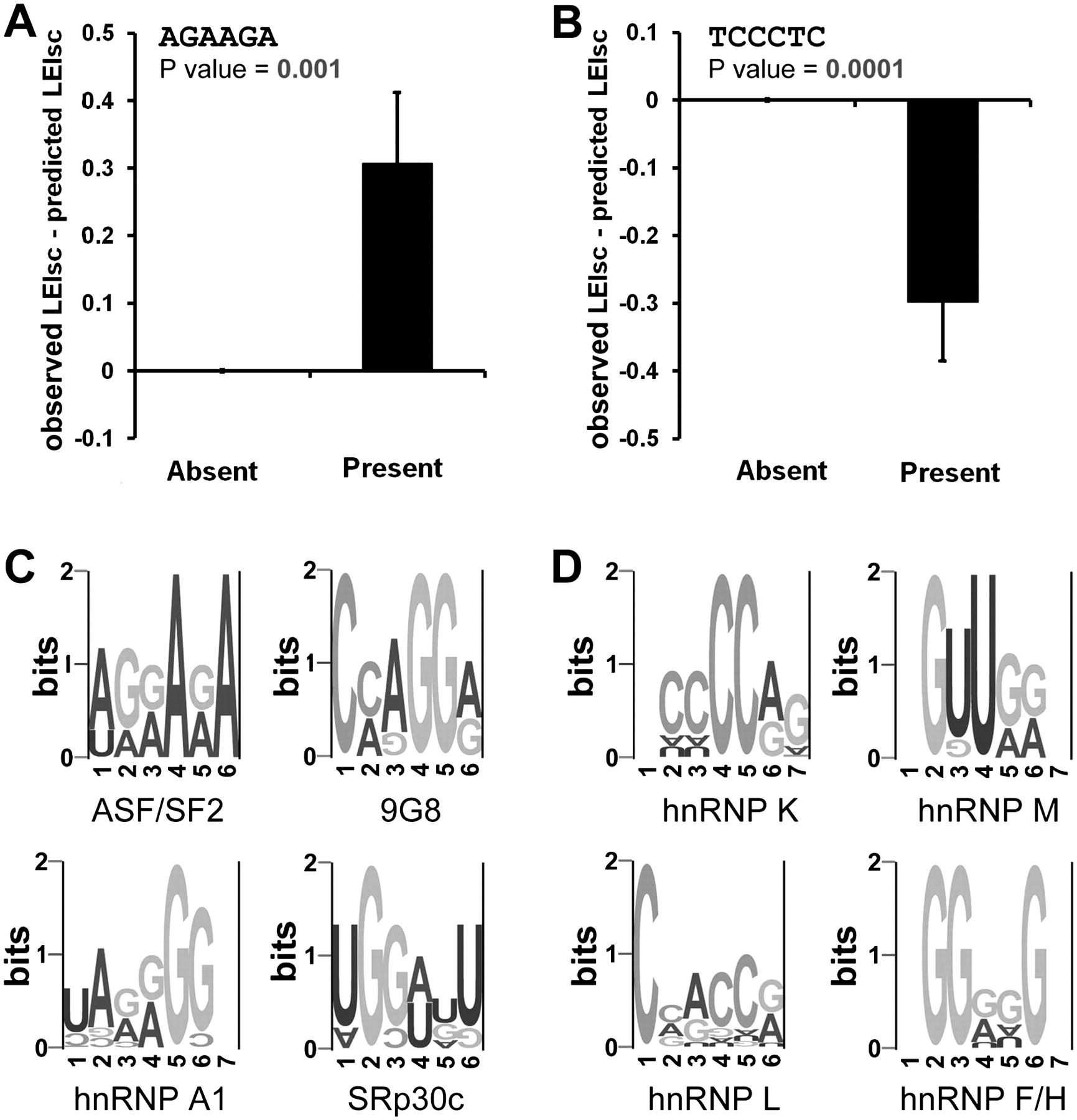 Six-mers that are candidates for combinatorial requirements. The hypothesis here is that the target 6-mer is influenced by a partner sequence within the 16-nt summed region, leading to a deviation from the additive model. (A) One example of a 6-mer (AGAAGA) that may have positive synergy with another within the 16-nt summed region. In the case of positive synergy, the observed splicing strength (LEIsc) would be significantly higher than that predicted whenever AGAAGA is present in the 16-nt region. The predicted LEIscs were converted from the splicing strength predicted by the additive model shown in Figure 4D by linearly scaling the values to fit the scale of the observed LEIscs. The total 20,480 molecules were classified into two categories: those in which this 6-mer was absent and those in which it was present. The average of (observed LEIsc—predicted LEIsc) in each category is shown. P-values were calculated using a t-test. Error bars are the SEM. (B) One example of a 6-mer (TCCCTC) that may have negative synergy with another within the 16-nt summed region. In this case, the observed splicing strength (LEIsc) would be significantly lower than that predicted whenever TCCCTC is present. P-values were calculated using a t-test. Error bars are the SEM. (C) Clusters of 6-mers that may have positive synergy with others and resemble the binding sites of known splicing factors. (D) Clusters of 6-mers that may have negative synergy with others and resemble the binding sites of known splicing factors.