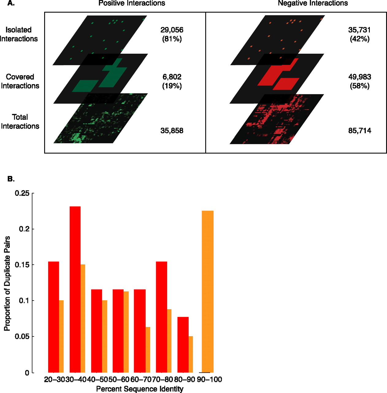 (A) The coverage of genetic interactions by XMOD biclusters. The interactions are divided into “covered” interactions that occur within a bicluster and “isolated” interactions that occur outside of a bicluster. Fifty-eight percent of negative interactions are covered compared to only 19% of positive interactions. (B) A plot of the proportion of negatively interacting duplicate pairs [either “isolated” (orange) or “covered” (red)] against the amino acid sequence identity of the duplicate pair.