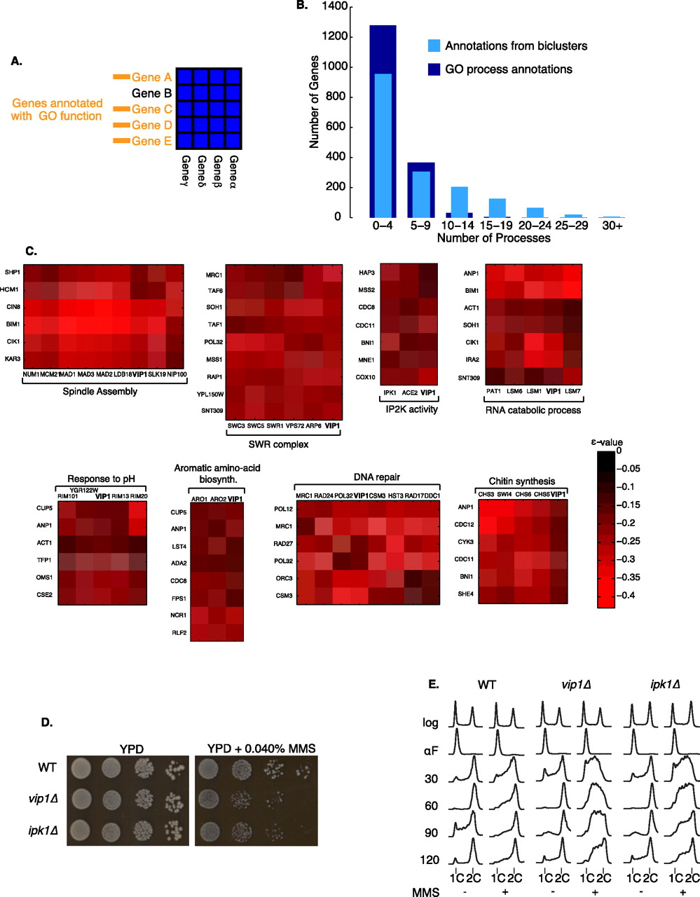 (A) Functional enrichment for each gene is derived from significant functional enrichments of other genes that appear in the same biclusters (see Methods for details). (B) A histogram of the number of processes associated with each gene as determined by the distinct functional enrichments of the biclusters of which that gene is a member (light blue) and the number of GO annotations currently given to that gene (dark blue). (C) Some example biclusters that contain the gene VIP1. VIP1 only has one GO annotation, but appears in a variety of highly enriched functional contexts. (D) vip1Δ and ipk1Δ exhibit reduced viability in the presence of MMS. Serial 10-fold dilutions of vip1Δ and ipk1Δ were spotted onto YPD or YPD + 0.040% MMS and incubated at 30°C for 3 d. (E) vip1Δ and ipk1Δ exhibit DNA replication defects in the presence of MMS. Cells were arrested in G1 and released synchronously into the cell cycle in either the presence or absence of 0.035% MMS. Histograms represent the cell cycle distribution after release from G1 arrest ± MMS for the specified times. Positions of cells with 1C and 2C DNA contents are indicated.