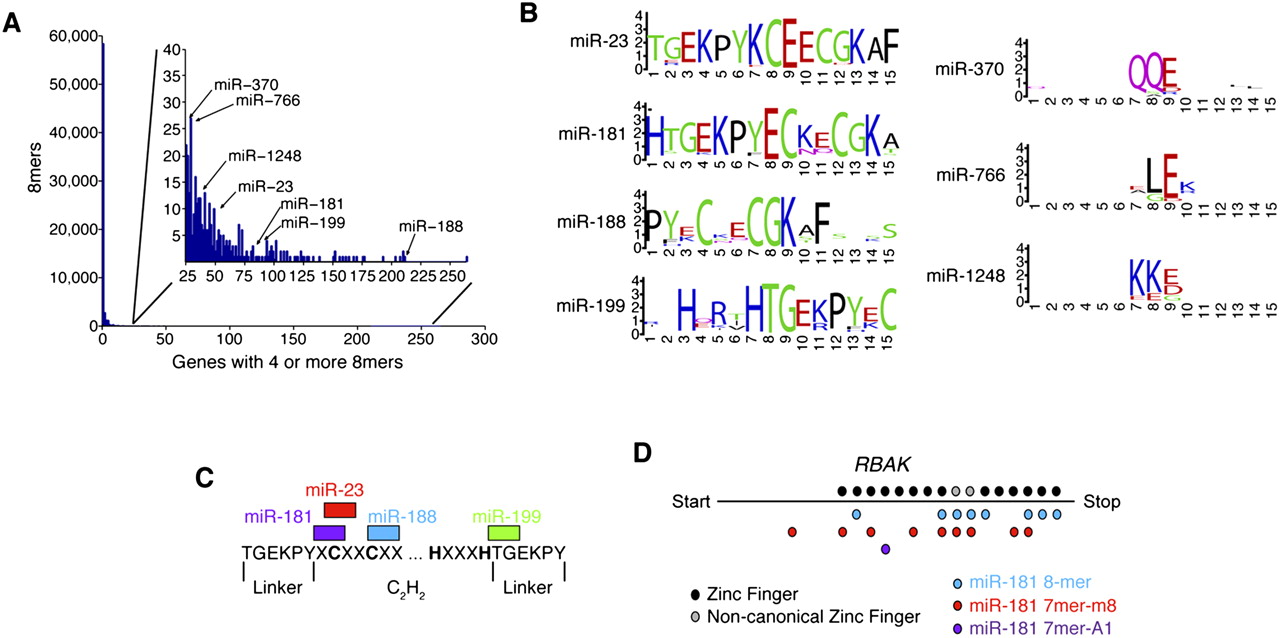 Potential targeting of frequent ORF repeats by additional miRNAs. (A) Motifs frequently repeated in ORFs of many mRNAs. The histogram considers all 65,536 possible 8-nt motifs and plots the number of these 8mers that match the indicated number of unique ORF at least four times. Also indicated are the seven miRNAs with 8mer sites among the 334 motifs that appeared at least four times in at least 25 genes. (B) The amino acid sequence coded by regions flanking 8mer ORF sites corresponding to the miRNA indicated. Sites overlap codons 7–9. Letter size indicates enrichment, visualized using WebLogo (weblogo.berkeley.edu). (C) Locations of 8mer sites within the repeated C2H2 domain. (D) Locations of C2H2 domains and miR-181 sites within the RBAK gene. Two C2H2 domains in which one of the histidines has been lost are shown as noncanonical zinc fingers. In cases where a single zinc finger contains both 8mer and 7mer sites, the 7mer overlaps the second cysteine in the motif.
