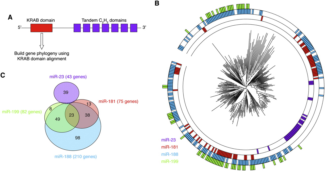 MicroRNA targeting of paralogous C2H2 genes. (A) Diagram of domain structure of C2H2 zinc-finger genes. (B) The relationship between shared ancestry of KRAB-containing C2H2 genes and shared miRNA sites. The phylogeny inferred from alignment of the KRAB domains is shown, marking at the perimeter those with at least four 8mer sites to the indicated miRNA. (C) Overlap between the predicted targets of the indicated miRNAs.