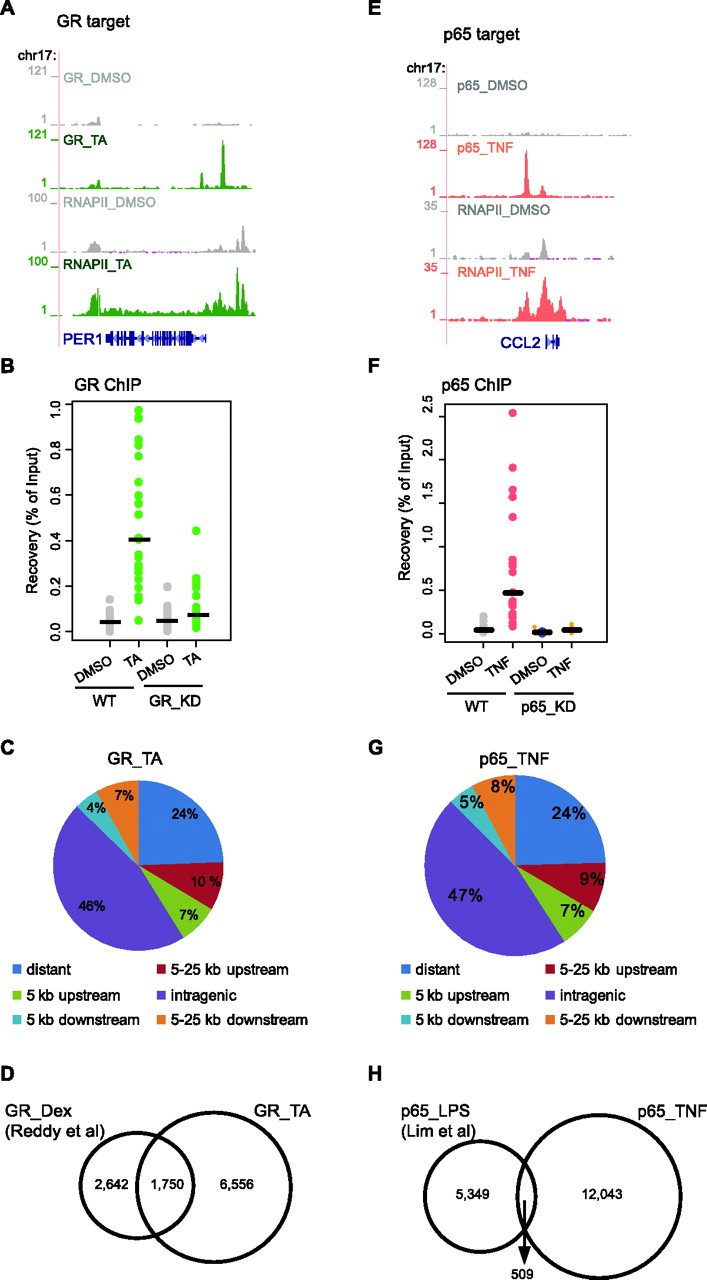 Genome-wide GR- and p65-binding sites upon TA or TNF treatment. (A,E) RNAPII and GR (A) or p65 ChIP-seq data (E) illustrate RNAPII occupancy and GR and p65 binding in the promoter and/or within the gene body of target genes. Strong binding sites were detected upon TA (green) and TNF treatment (pink), whereas residual binding was observed in the absence of ligand (gray). Data were viewed in the University of California at Santa Cruz (UCSC) Genome Browser. The maximum number of overlapping tags, representing peak height, is indicated on the y-axis. (B,F) Validation of GR-binding sites (B) and p65-binding sites (F). Strip plots of GR ChIP–qPCR data for 25 randomly selected GR sites from WT and GR_KD cells (B) and p65 ChIP–qPCR data for 20 randomly selected p65 sites from WT and p65_KD cells (F) treated as indicated. Results are expressed as a percentage of input chromatin. Binding sites with fold induction (relative to DMSO) >2 are regarded as validated. Establishment of GR_KD and p65_KD cells are described in Supplemental Figure 2. (C,G) Genomic location analysis of GR-binding sites (C) and p65-binding sites (G). GR sites identified upon TA treatment (C) and p65 sites identified upon TNF treatment (G) were divided into the following categories based on their position relative to the nearest gene: distant (>25 Kb), within 5 Kb upstream, within 5 kb downstream, within 5–25 kb upstream, within 5–25 kb downstream and intragenic (exon, intron, and within 0–5 kb up- and downstream). The Pink Thing (http://pinkthing.cmbi.ru.nl) was used for the analysis. (D) Comparison of genome-wide GR profiling data. Venn diagram of the overlap of GR sites identified in the present study (8306 sites, ChIP-seq using HeLa B2 cells treated with TA for 4 h) with those identified in Reddy et al. (2009) (4392 sites, ChIP-seq using A549 cells treated with Dex for 1 h). (H) Comparison of genome-wide p65 profiling data. Venn diagram of the overlap of p65 sites identified in the present study (12,552 sites, ChIP-seq using HeLa B2 cells treated with TNF for 1 h) with those identified in Lim et al. (2007) (5858 sites, ChIP-PET using THP-1 cells treated with LPS for 1 h).
