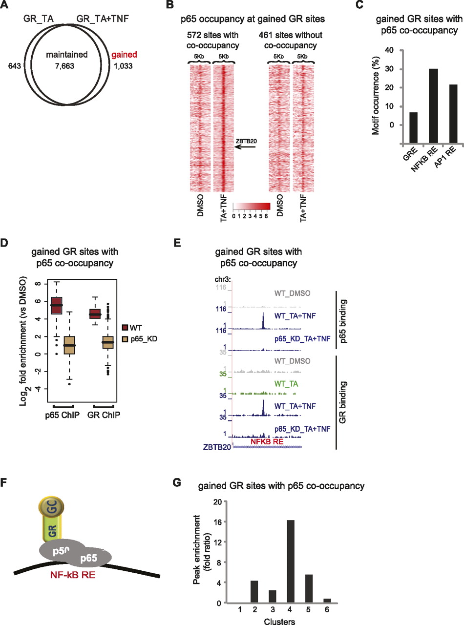 Gained GR-binding sites and their correlation to gene expression profile. (A) Profile of GR-binding sites. Venn diagram of the overlap of GR sites detected upon treatment with TA or TA + TNF. (B) Tag density maps depicting the pattern of p65 occupancy around (peak mode ±2.5 kb) gained GR sites. Color density indicates the level of p65 occupancy (square root of tag density; see scale below) in a 250-bp window. The position of the example presented in E (ZBTB20) is indicated. (C) Motif occurrence within gained GR sites co-occupied by p65. The bar graph shows the percentage of sites containing the indicated motifs. (D) Boxplots of GR and p65 tag counts distributed under peak locations (log2 scale) of gained GR sites co-occupied by p65, upon TA + TNF treatment, in WT cells and the respective tag distributions under the same locations in p65_KD cells. (E) GR and p65 ChIP-seq data illustrate binding of GR and p65 at gained GR sites co-occupied by p65, detected upon the indicated treatments, in WT and p65_KD cells. Data were viewed in the UCSC Genome Browser. The maximum number of overlapping tags, representing peak height, is indicated on the y-axis. (F) Model of GR and p65 interaction at gained GR sites co-occupied by p65. (G) Enrichment of gained GR sites co-occupied by p65 that are assigned to the genes of each cluster. Peak enrichment fold ratio represents the ratio of the nonrandom enrichment (ratio of assigned binding sites to the total number of genes in each cluster) to the random enrichment (parallel enrichment calculation for 100 random sets of nonregulated genes, performed to assess the statistical significance of the peak enrichment analysis).