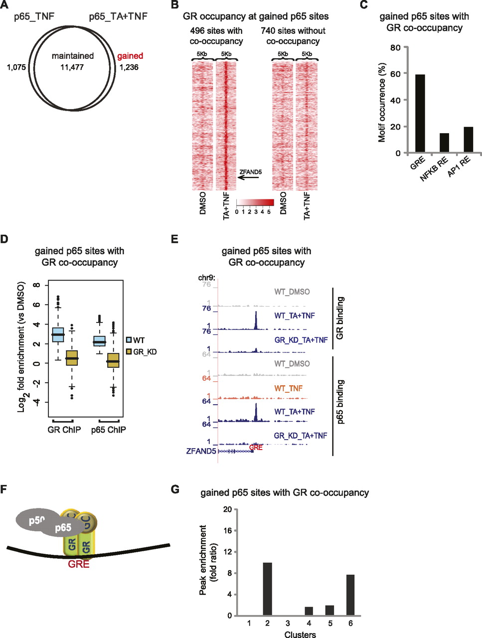 Gained p65-binding sites and their correlation to gene expression profile. (A) Profile of p65 binding sites. Venn diagram of the overlap of p65 sites detected upon treatment with TNF or TA + TNF. (B) Tag density maps depicting the pattern of GR occupancy around (peak mode ±2.5 kb) gained p65 sites. Color density indicates the level of GR occupancy (square root of tag density; see scale below) in a 250-bp window. The position of the example presented in E (ZFAND5) is indicated. (C) Motif occurrence within gained p65 sites co-occupied by GR. The bar graph shows the percentage of sites containing the indicated motifs. (D) Boxplots of GR and p65 tag counts distributed under peak locations (log2 scale) of gained p65 sites co-occupied by GR, upon TA + TNF treatment, in WT cells, and the respective tag distributions under the same locations in GR_KD cells. (E) p65 and GR ChIP-seq data illustrate binding of p65 and GR at gained p65 sites co-occupied by GR, detected upon the indicated treatments, in WT and p65_KD cells. Data were viewed in the UCSC Genome Browser. The maximum number of overlapping tags, representing peak height, is indicated on the y-axis. (F) Model of GR and p65 interaction at gained p65 sites co-occupied by GR. (G) Enrichment of gained p65 sites co-occupied by GR that are assigned to the genes of each cluster. Peak enrichment fold ratio is as described in Figure 5G.