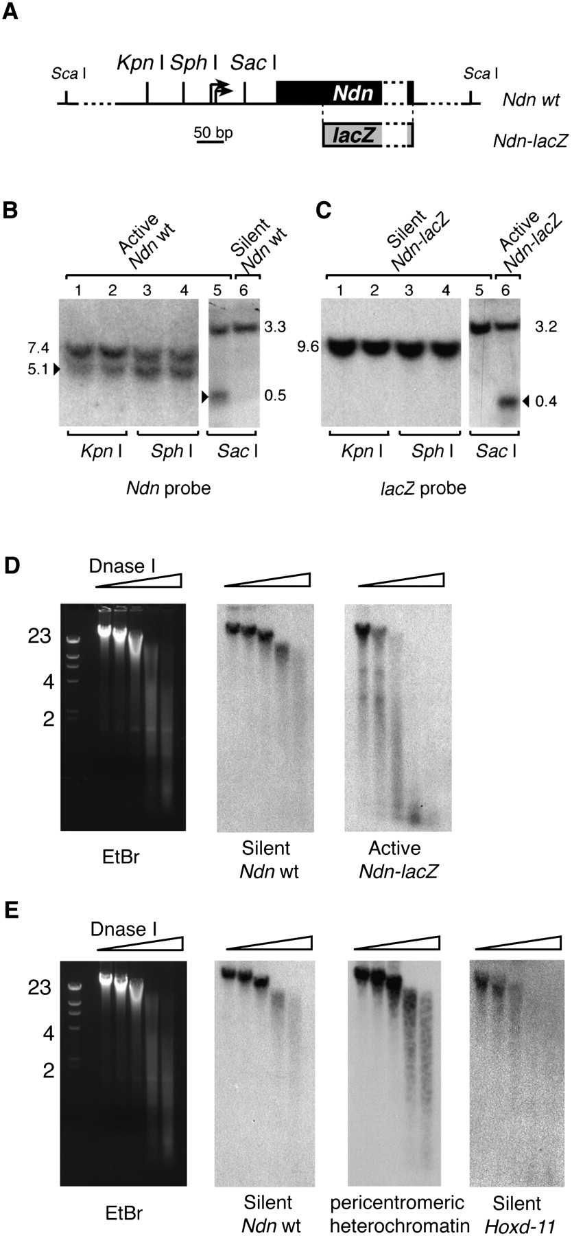 Transcriptional silencing at Ndn is associated with a chromatin structure that occludes DNA access to nucleases. (A) Ndn promoter organization with the position of restriction sites. The two transcription initiation sites are indicated with arrows. The position of lacZ in the fusion allele is shown. (B) Nuclei were prepared from E17 fetal brains and digested with KpnI, SphI, or SacI. DNA was prepared, cut with a second restriction enzyme (e.g., ScaI), and run on an agarose gel. DNA was then transferred to a nylon membrane, which was hybridized with a Ndn coding sequence [α-32P]-labeled probe. Ndn coding sequence is deleted in the Ndn-lacZ allele, and therefore this probe reveals only the wild-type Ndn allele. In all lanes, a single band indicates absence of digestion, whereas the presence of a second smaller DNA fragment (arrowhead) indicates digestion by the restriction enzyme at the Ndn promoter. In lanes 1 to 5, nuclei were prepared from fetal brains carrying a paternally contributed (active) wild-type allele and a maternally contributed (silenced) Ndn-lacZ fusion allele. In lane 6, nuclei were prepared from fetal brains carrying a paternally contributed Ndn-lacZ allele and a maternally contributed wild-type Ndn allele. (C) The membrane was then stripped and rehybridized with the lacZ probe. (D) Nuclei were prepared from E17 fetal brains carrying a maternally contributed (silenced) wild-type Ndn allele and a paternally contributed (active) Ndn-lacZ fusion allele, and digested with increasing amounts of DNase I. DNA was prepared, run on an agarose gel, and transferred to a nylon membrane that was hybridized with a first [α-32P]-labeled probe. After autoradiography, the membrane was stripped and rehybridized with a second probe. Ethidium bromide (EtBr) staining of DNA before transfer is shown on the left. The membrane was hybridized successively with Ndn exon probe, revealing the silenced wild-type Ndn allele, and lacZ probe, which reveals the active paternally contributed Ndn-lacZ allele. (E) The membrane was first hybridized with a probe against the silenced wild-type Ndn allele, then with a major satellite repeat probe, which reveals pericentromeric heterochromatin DNA, or a Hoxd11 probe.