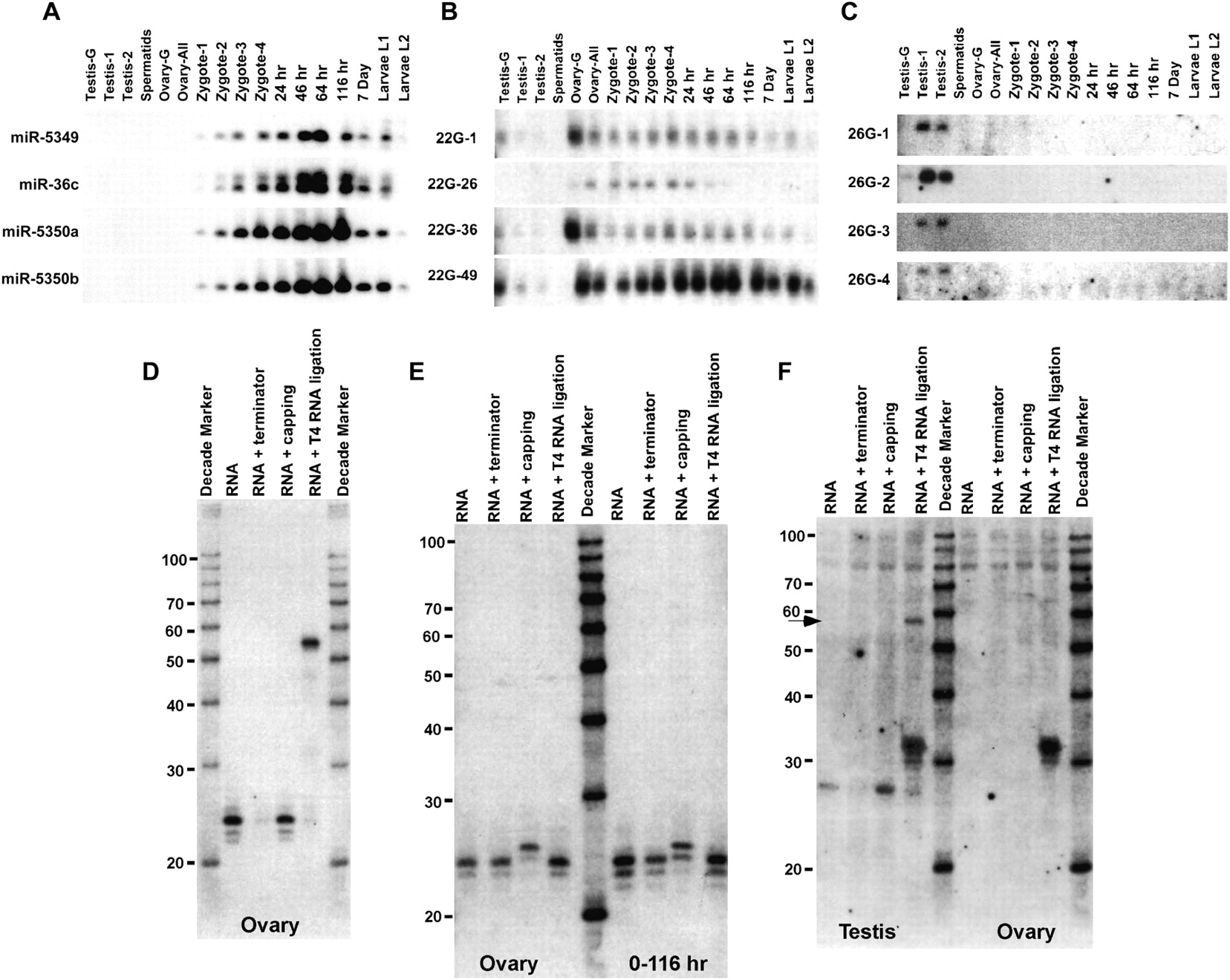 Ascaris small RNAs expression and their 5′ phosphate termini. (A) Northern blots illustrating intrauterine zygotic expression of miRNAs (for whole blots, see Supplemental Fig. S6A). (B) Northern blots illustrating dynamic expression of 22G-RNAs. (C) Northern blots illustrating expression of testis-specific 26G-RNAs. (D) Ascaris miRNAs have a 5′ monophosphate. Northern blot of Ascaris LMW RNA untreated or treated with terminator, GTP and guanylyltransferase (capping), or ligation of an RNA oligonucleotide (T4 RNA ligation) and probed with asu-miR-5347 probe. Note that the miRNA is degraded by terminator, is uncapped, and can be ligated to an RNA oligonucleotide, indicating the 5′ end is a monophosphate. (E) Ascaris 22G-RNAs have 5′ polyphosphates. Northern blot as in D probed with a 22G-RNA probe. Note that the 22G-RNA can be capped but is not susceptible to terminator or T4 RNA ligation, suggesting the 5′ end of the RNA is a di- or triphosphate. (F) Ascaris 26G-RNAs have a 5′ monophosphate. Northern blot as in D probed with a 26G-RNA probe. Note that the 26G-RNA is testis specific and is degraded by terminator, is uncapped, and can be ligated to an RNA oligonucleotide, indicating the 5′ end is a monophosphate. The band at ∼32 nt in the RNA+T4 RNA ligation is an artifact in the ovary.
