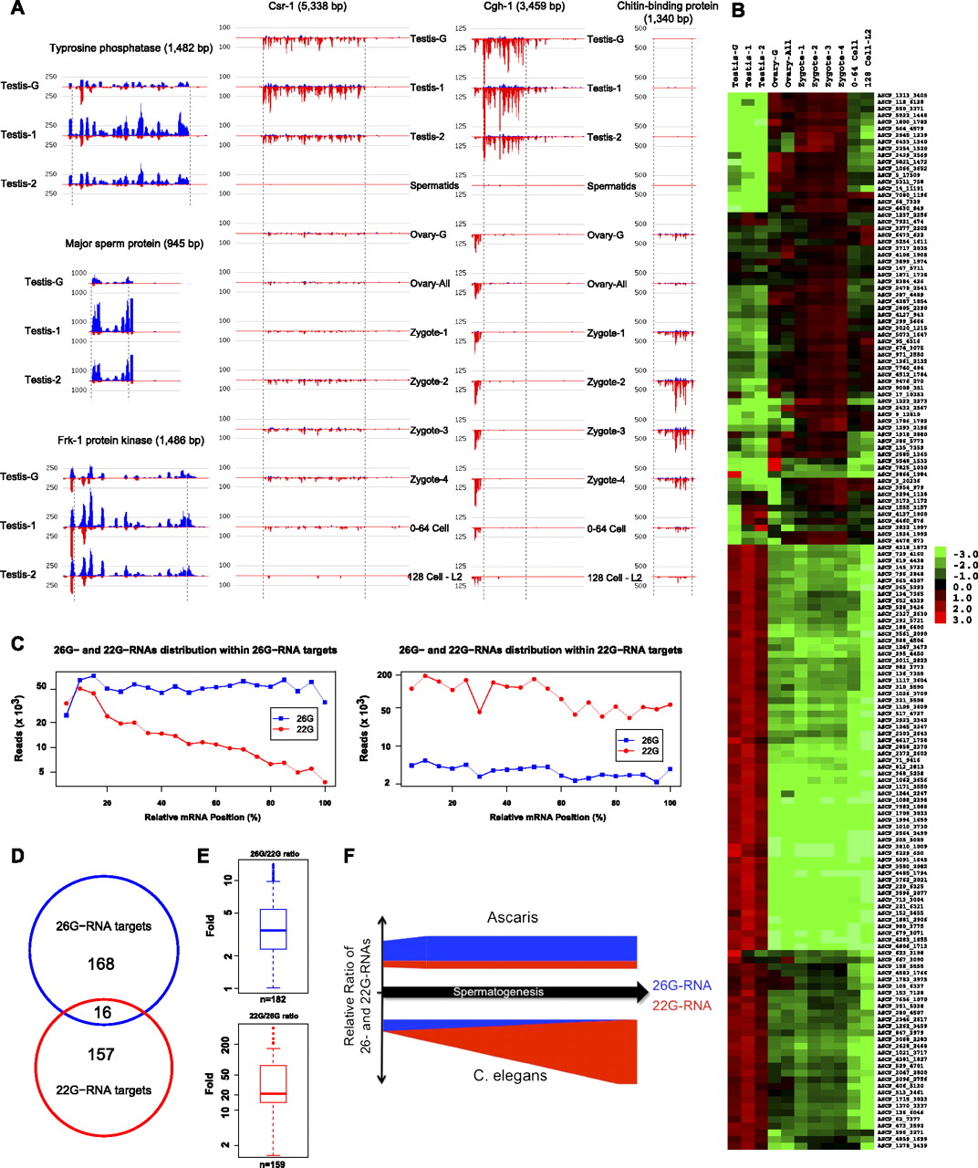 Ascaris 26G-RNAs and 22G-RNAs targets. (A) Examples of distribution of 26G- and 22G-RNAs to mRNAs throughout development. Note that all small RNAs are antisense. (Red) 22G-RNAs; (blue) 26G-RNAs. Vertical dashed lines indicate the start and stop of the ORF. Numbers on left indicate the normalized read frequency of the gray line. Note that for 26G-RNA targets, only the profiles from testis 26G-RNAs are shown; for their complete profiles, see Supplemental Table S7 and Supplemental Figures S9 and S10. (B) Dynamic expression profiles of 22G-RNAs to 159 exemplary targets (see text). Normalized As.22G RNA reads mapping to each target mRNA were used for the heatmap. For each target, colors represent log2 values of fold changes to the average read frequencies of the As.22G RNAs during development. (C) Distribution of 26G- and 22G-RNAs on mRNAs predominantly targeted by one of the two types of small RNAs. Only mRNAs identified as near full length are used and include 138 26G-targeted mRNAs and 97 22G-targeted mRNAs (see Supplemental Table S7; Supplemental Figs. S9, S10). Plotted is the sum of the counts (y-axis) against the relative position (x-axis) on the cDNA from 5′ to 3′, with the 5′ end of the mRNA designated as 1 and the site of polyadenylation at the 3′ end designated as 100. (D) Venn diagram illustrating the relationship between the mRNAs targeted by 26G- or 22G-RNAs. (E) Ratio of defined testis 26G-RNA/22G-RNAs mRNA targets. (Upper panel) 26G-RNA targets, the 26G/22G ratio; (lower panel) 22G-RNA targets. (F) Expression profile of 26G-RNAs and 22G-RNAs in spermatogenesis is different for Ascaris and C. elegans (see Discussion). Note that for C. elegans, the total level of 26G-RNAs decreases during spermatogenesis with a concomitant and dramatic increase in 22G-RNAs targeting the same mRNAs. In contrast, the ratio of Ascaris 26G/22G RNAs to mRNAs remains the same during spermatogenesis and the 26G-RNAs are always the dominant small RNA species. Note that the figure does not represent absolute levels of the RNAs.