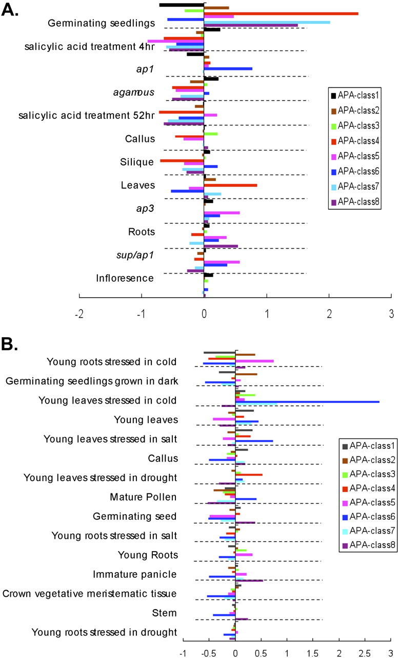 Tissue-specific usage of different APA classes. The x-axis shows the relative distance (or difference) to the average usage of all libraries analyzed. The library designations are on the left. (A) Libraries from Arabidopsis. (B) Libraries from rice. Libraries most significantly different from average usage of APA are on top (χ2 test).