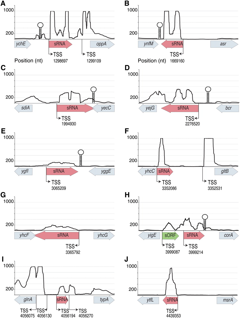 Detection of novel sRNAs in intergenic regions. (A–J) Expression profiles of intergenic regions. The y-axes denote coverage at each nucleotide, limited to a maximum of 1000 (dashed lines). Positions of transcription start sites (TSS) and terminators (stem–loop structures) found within each intergenic region are depicted. Nucleotide positions follow the numbering of the E. coli genome (NC_000913.2). Wide arrows on x-axes contain named ORFs (gray), sRNAs (pink), and an unnamed small ORF (green). Lengths of flanking genes are not drawn to scale.