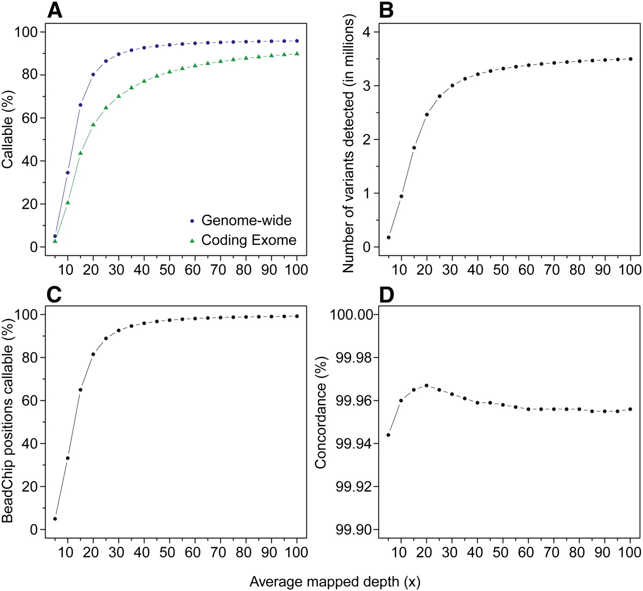 Genotype calling as a function of average mapped depth. The x-axes represent the average mapped depth of each data set, and the y-axes represent the proportion of the whole genome (dark blue circles) and coding exome (green triangles) that is callable (A), the number of SNVs detected (B), the proportion of Illumina BeadChip positions callable (C), and the concordance rates with the BeadChip calls (D).