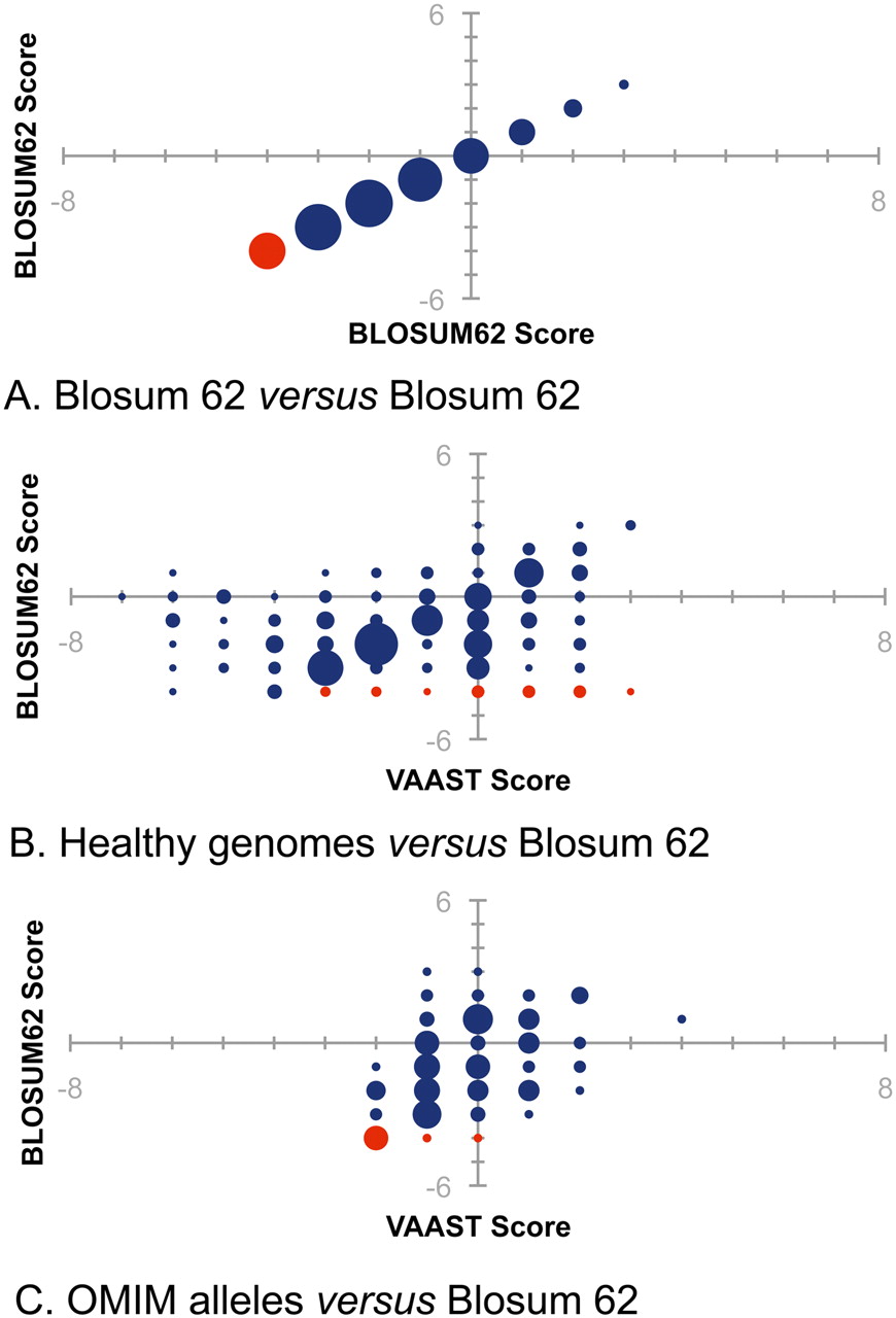 Observed amino acid substitution frequencies compared to BLOSUM62. Amino acid substitution frequencies observed in healthy and reported for OMIM disease alleles were converted to LOD-based scores for purposes of comparison to BLOSUM62. The BLOSUM62 scores are plotted on the y-axis throughout. (Red circles) stops; (blue circles) all other amino acid changes. The diameter of the circles is proportional to the number of changes with that score in BLOSUM62. (A) BLOSUM62 scoring compared to itself. Perfect correspondence would produce the diagonally arranged circles shown. (B) Frequencies of amino acid substitutions in 10 healthy genomes compared to BLOSUM62. (C) OMIM nonsynonymous variant frequencies compared to BLOSUM62.