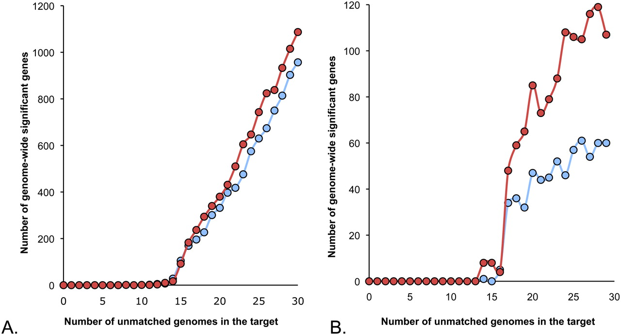 Impact of population stratification and platform bias. Numbers of false positives with and without masking. (A) Effect of population stratification. (B) Effect of heterogeneous platform and variant calling procedures. (Red line) Number of false positives without masking; (blue line) after masking. Note that although masking has little effect on population stratification, it has a much larger impact on platform bias. This is an important behavior: Population stratification introduces real, but confounding signals into disease gene searches; these signals are unaffected by masking (A); in contrast, VAAST's masking option removes false positives due to noise introduced by systematic errors in platform and variant calling procedures (B).