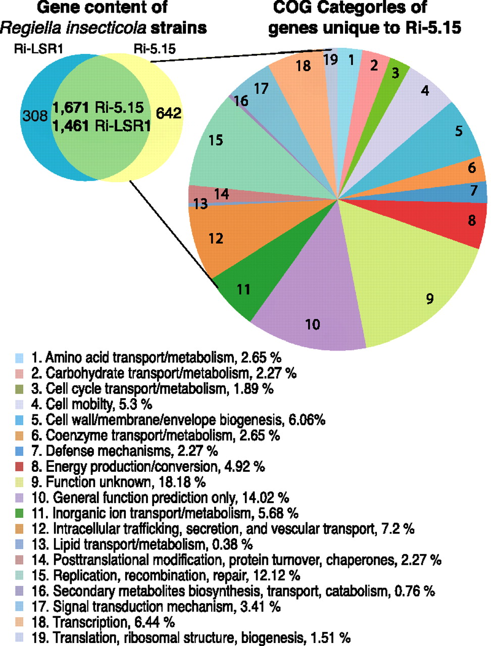 Comparative genomics of R. insecticola LSR1 and R. insecticola 5.15. The left pie represents the number of genes homologous and unique to each R. insecticola strain. The right pie represents the relative proportion of novel R. insecticola 5.15 genes in 19 COG categories.