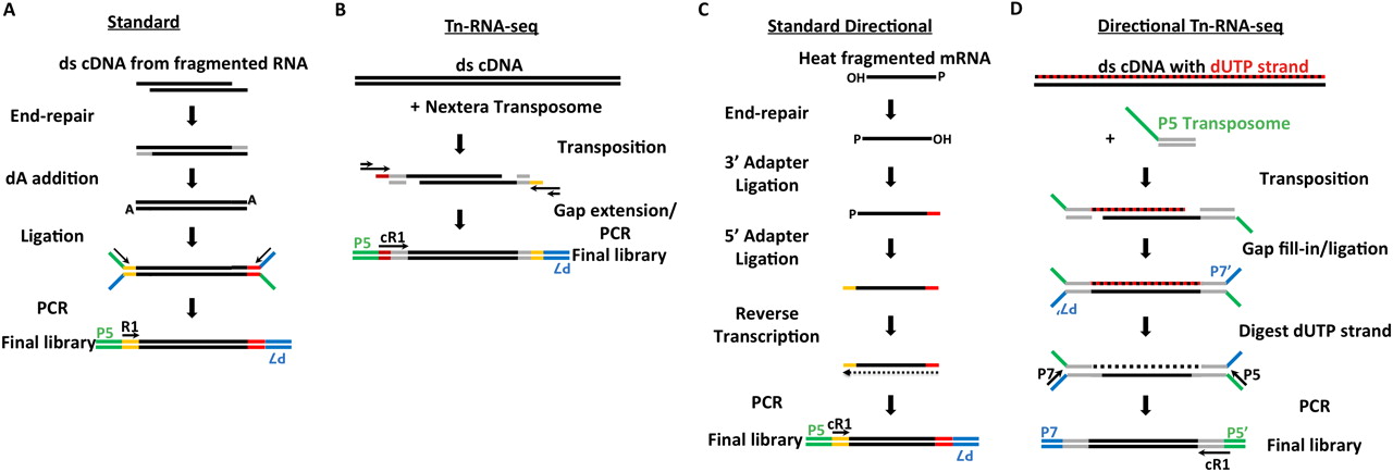 RNA-seq methods overview. (A) In the standard adapter ligation RNA-seq library construction protocol, double-stranded cDNA made from fragmented mRNA is subjected to end repair, dATP addition, adapter ligation, size selection, and PCR. (B) For the Tn–RNA-seq method described here, double-stranded cDNA is incubated with transposome (transposase complexed with transposon) and then undergoes PCR. (C) In the directional RNA ligation approach (standard directional), poly(A)-selected mRNA is fragmented with heat and end repaired. 3′ and then 5′ adapters are ligated onto single-stranded RNA before reverse transcription, followed by PCR. (D) The directional Tn–RNA-seq library construction described here starts with double-stranded cDNA, in which the second strand synthesized contains uracils instead of thymines. cDNA synthesis is followed by transposition of sequencing adapters, gap fill-in/ligation, USER digestion, and PCR. P5 and P7 correspond to Illumina cluster generation primers. R1 identifies the sequencing primer and cR1 indicates custom sequencing primer. (′) Reverse complement.