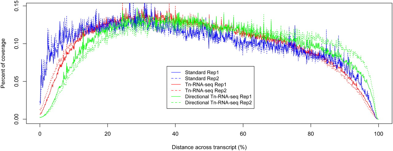 Transposon-based libraries show expected depletion of coverage at 5′ ends of transcripts. The percentage of coverage (y-axis), averaged across all transcripts is plotted as a function of distance across the transcripts (x-axis). 0% corresponds to the 5′ ends and 100% corresponds to the 3′ ends of transcripts.
