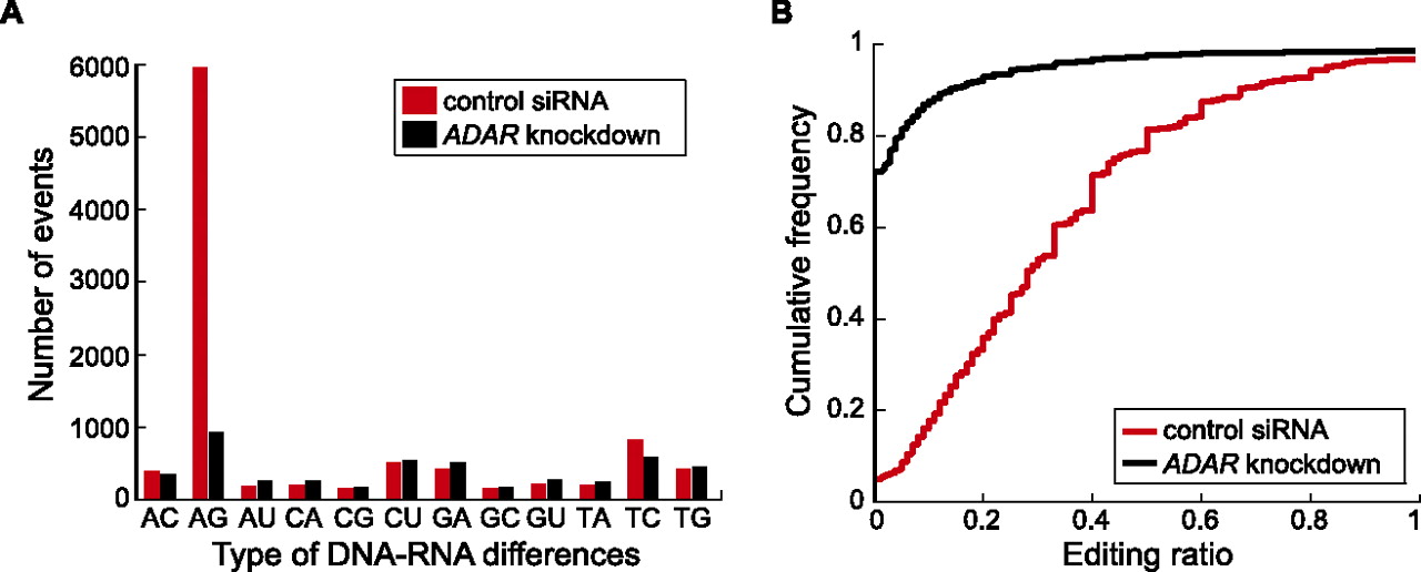 DNA–RNA differences identified via RNA-seq. (A) Number of events for the 12 types of differences between RNA reads and genomic DNA sequences in samples transfected with control siRNA and ADAR siRNA, respectively. Labels of x-axis denote DNA and RNA nucleotides (e.g.: “AC” denotes “A” in DNA and “C” in RNA). (B) Empirical cumulative distribution function of editing ratios of putative A-to-I editing events identified from RNA-seq. A union of editing events identified in the two samples is included (6422 in total) in each curve. For nonediting events in one sample (those that failed the statistical identification procedure), the editing ratio was calculated as the number of reads with the “G” nucleotide at the predicted editing position divided by the total number of reads at that position.