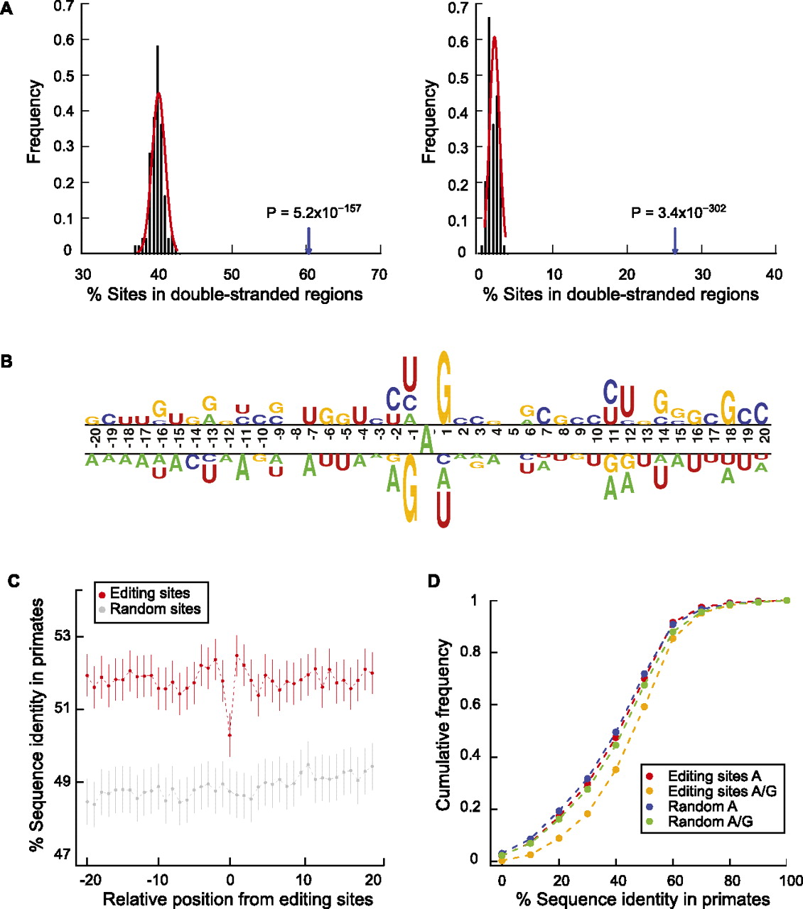 Sequence features of predicted A-to-I editing sites and the flanking regions. (A) Double-stranded regions in the neighborhoods of predicted A-to-I editing sites. (Left) Editing sites and controls are located in Alu elements. Controls were picked as random As in such regions with matched G+C content relative to the test regions (Supplemental Methods). Percentage of editing sites in double-stranded regions shown by arrow; percentage of control sites in double-stranded regions shown by black histogram. P-value was calculated by fitting a normal distribution to the control histogram. (Right) Same as the left panel, but editing sites and controls are outside of Alu elements. (B) Sequence preferences for base positions flanking predicted A-to-I editing sites. Editing sites (the A nucleotide at position 0) are aligned together. Sequence preference is represented using a two-sample logo program (Vacic et al. 2006). (C) Conservation of the immediate neighborhood of predicted A-to-I editing sites. Sequence conservation (percentage of identity) of each position flanking editing sites was calculated using the UCSC multiz46way alignments of primate genomes (Supplemental Methods). Random controls were picked for each editing site in the same type of regions (e.g., Alus in coding exons, Alus in introns). Vertical lines represent 95% confidence intervals. (D) Sequence conservation among primates at the edited sites before and after editing. Cumulative distribution functions are shown for percentage of identity at the editing sites assuming the nucleotide being A and (A or G) in human, respectively. Random controls were picked similarly as described in C.