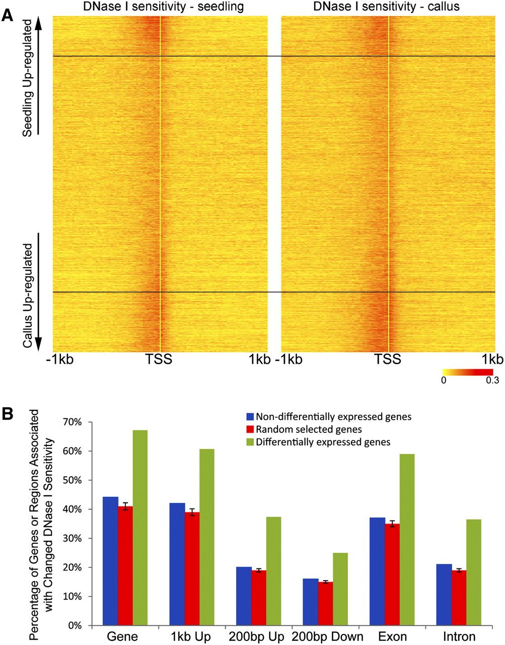 High DNase I sensitivity of the DH sites associated rice genes that differentially expressed in the seedling and callus. (A) Heatmap of DNase I sensitivity surrounding the TSSs of genes. Genes were sorted out based on fold change of gene expression of seedling relative to callus. The genes in the two panels are in the same order. The genes above/under the black lines were significantly up-regulated in the seedling and callus, respectively. DNase I sensitivity was indicated by DNase-seq read number per bp genome per million reads. (B) Percentage of differentially expressed genes associated with DNase I sensitivity changes between the seedling and callus in their genic region, 1000-bp and 200-bp upstream region of TSS, 200 bp downstream from the gene, exon, and intron. We used similar expressed genes and genes randomly selected (10 times) as a control, with the same sample size of differentially expressed genes.