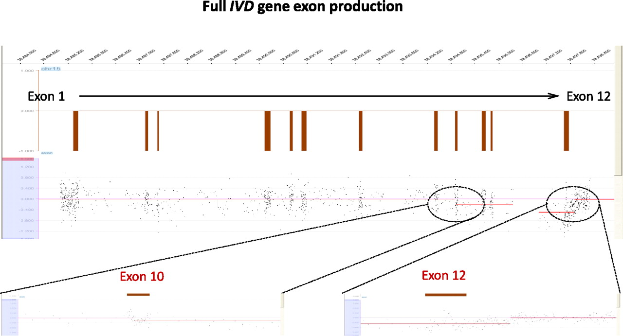 Comparative genomic hybridization data for the IVD gene locus (chr15:40,697,686–40,713,512) in patient 4551 using a custom-designed 385K high-density array from NimbleGen. The zoomed-in view of the corresponding array highlights the breakpoints for a patient with a deletion mutation encompassing exons 10–12 with breakpoints in intron 9 and the 3′ UTR.