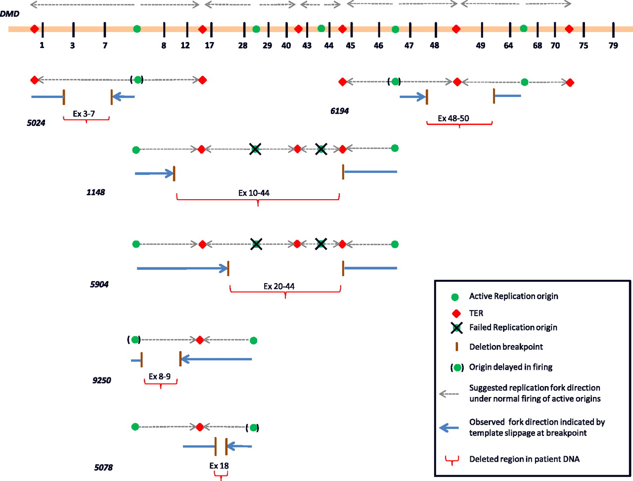 Illustration of the proposed deletion mechanism as explained by failure of replication origins in different patient cases. As shown for each of the six patient cases (5024, 6194, 1148, 5904, 9250, and 5708), failure/delay in origin firing may result in incomplete replication, causing DNA deletion. For example, in patient 5904, failure of origins in introns 28 and 43 may have led to deletions of exons 20–44. The horizontal bar at the top represents the DMD gene with the five mapped replication origins (green circles) and the six termination regions (red rhomboids), along with adjacent numbered exons (vertical black bars). The numbers in bold italics represent the patient sample. For each patient sample illustrated above, we show the template with origins and terminal regions adjacent to the deletion (gray arrowheads showing the direction of replication forks). (Brown horizontal bars) Deletion breakpoints (or replication cease points); (blue bars) patient DNA (or newly replicated DNA); (blue arrowheads) the replication fork direction at breakpoint. The directions of the replication forks are predicted based on the presence of re-replicated sequences at either breakpoint junction. For example, in sample 5024, the template slippage was found at the breakpoint in intron 7, whereas in sample 6194, the template slippage and sequence repetition was found to be at the breakpoint in intron 47. (Red horizontal braces) Corresponding deletion, with the deleted exons mentioned. The crossed-out origins represent replication origins that probably failed to fire during S phase.