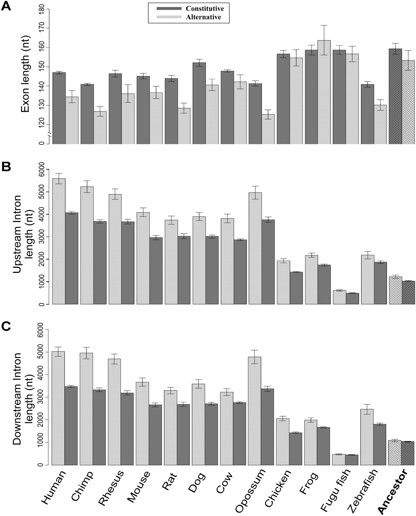 Length of constitutive and alternative exons and their flanking introns in 12 vertebrate genomes and reconstruction of ancestral length. (A) Mean lengths of alternative (light gray) and constitutive (dark gray) exons. The reconstructed most parsimonious ancestral length is plotted in the right-most column. Error bars represent the standard error of the mean. (B,C) As in A, for the intronic regions upstream of and downstream from alternative and constitutive exons, respectively.