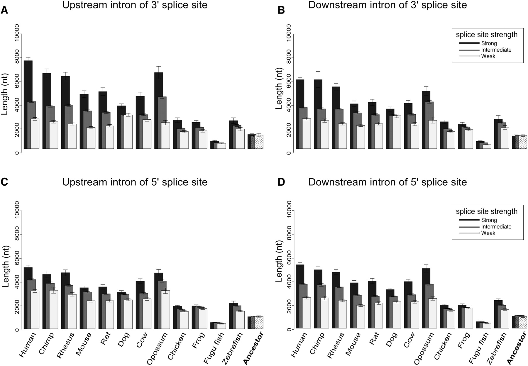 Constitutive flanking introns’ length with relation to splice site strength for 12 species. Upstream (A) and downstream (B) introns that flank constitutive exons were divided into three groups based on 3′ss strength: strong splice site (black), intermediate splice site (gray), and weak splice site (white). Same as for A and B, but for upstream (C) and downstream (D) introns based on 5′ss strength. The reconstructed ancestral lengths are plotted in the right-most column.