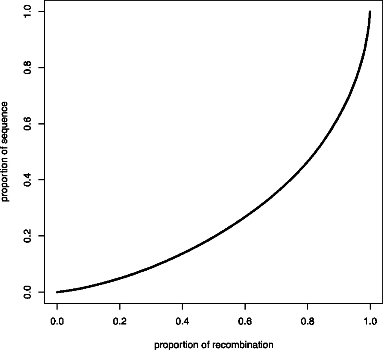 Proportion of sequence versus the proportion of recombination. The cumulative proportion of the total length of the dog recombination map is plotted against the proportion of the genome that has been sampled. This analysis suggests that 80% of all recombination events occur in 46% of the dog genome. Due to the relatively sparse marker density in our data set, we believe that this figure represents an underestimate of the true recombination rate variation in dog.