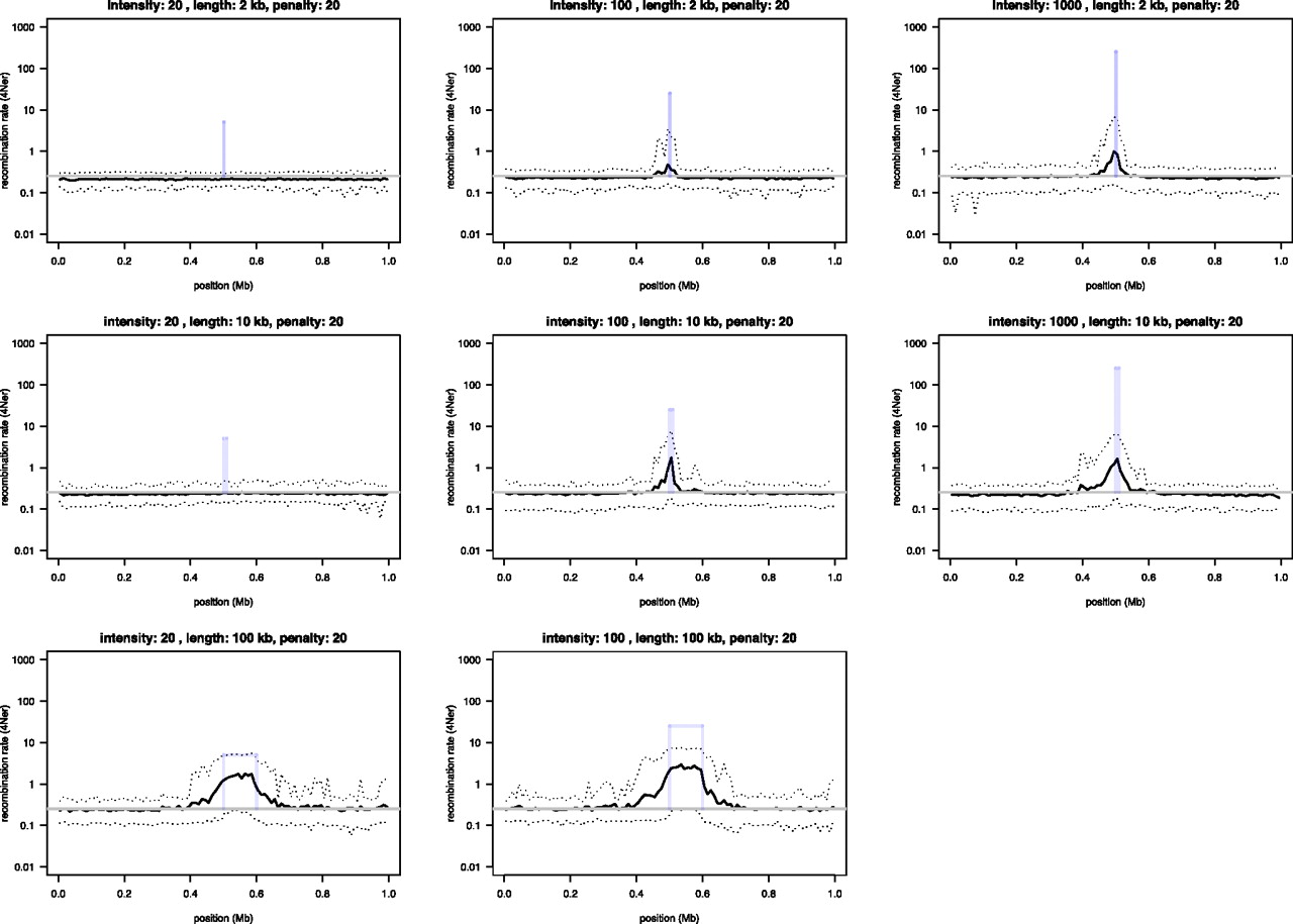 Power simulations to test the ability of interval to infer recombination rate variation in the dog. By using a realistic demographic model, we generated genotype data for 1-Mb regions centered around a hotspot of recombination with known intensity and width. Recombination rates outside the hotspot were kept uniform. Nine different scenarios were simulated in which hotspot intensity that varied from weak (20× background rate), to intermediate (100× background rate), to strong (1000× background rate) were combined with three different hotspot widths (2, 10, and 100 kb). We set interval to penalize rate change (bp = 20) and inferred recombination rates in 100 simulated data sets for each scenario, and compared the average inferred rate (solid black line) to the uniform background rate (gray solid line), as well as the hotspot intensity (solid blue bars) used in the simulations. Dotted lines show the 2.5 and 97.5 percentiles of the sampling distribution.