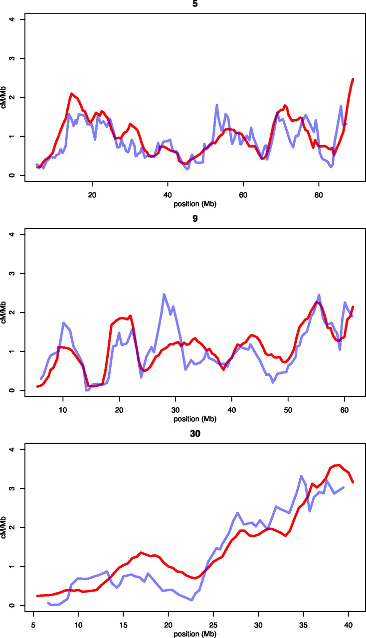 Comparing recombination rates in the LD-based recombination map and a previously published linkage map for chromosomes 5, 9, and 30. Recombination rates of the linkage map (blue lines) and our LD-based inference (red lines) have been averaged across 5-Mb windows prior to plotting. We rescaled population genetic estimates by estimating the effective population size (Ne) of the dog from comparing the complete extension of the overlapping portions of the two complete recombination maps.