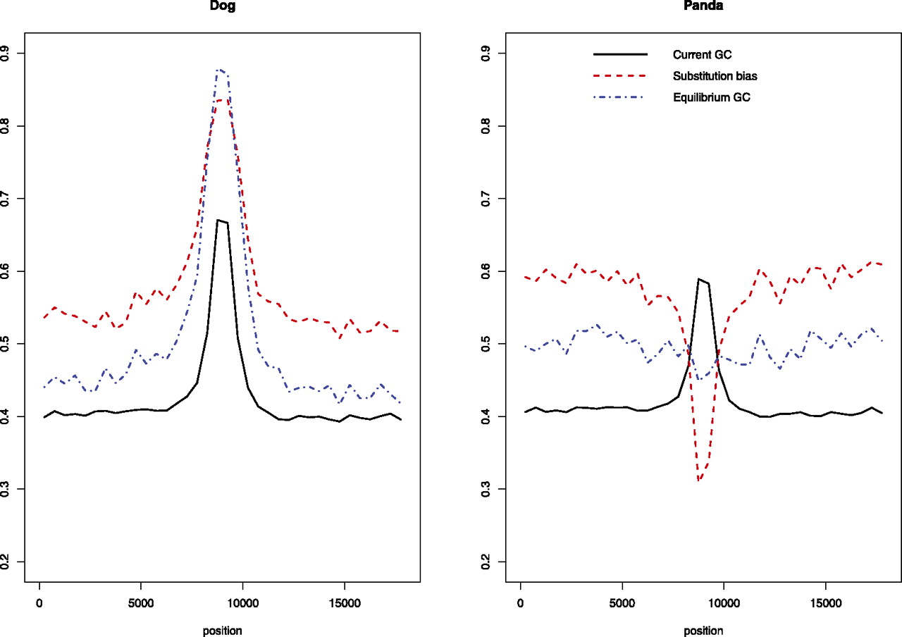 The molecular evolution of GC peaks in the dog and panda. Three hundred nine GC peaks for which we had alignment data for the dog, panda, and cat were centered in 18-kb windows prior to analyses. We used a sliding window of 500 bp to estimate average values of three different parameters related to the evolution of base composition near GC peaks in the dog and panda. First, solid black lines depict the average current GC content. Second, red lines show the nucleotide substitution bias (SB = WS/[WS + SW], where numbers of strong-to-weak [GC-to-AT] and weak-to-strong [AT-to-GC] substitutions are SW and WS, respectively). Third, blue lines show the equilibrium GC content (GC* = u/[u + v], where the rate of strong-to-weak [GC-to-AT] and weak-to-strong [AT-to-GC] substitutions are u and v, respectively).