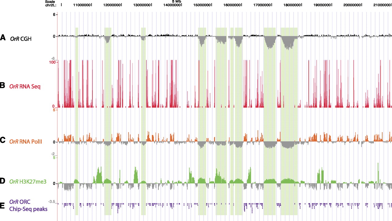 Under-replicated regions are restrictive for ORC2 and RNA Pol II binding and are marked by weak binding of H3K27me3. (A) aCGH of proximal half of chromosome 2L, as described in Figure 1A. (B–E) RNA-seq, RNA Pol II ChIP-chip, H3K27me3 ChIP-chip, and ORC2 ChIP-seq peaks in Oregon-R (OrR) third-instar salivary glands, respectively. Total Illumina RNA sequencing reads are plotted; RNA Pol II ChIP was normalized to IgG control ChIP, and H3K27me3 ChIP data to input DNA. ORC2 ChIP-seq peaks were called by SPP compared with input sequencing lane; peaks for these data are organized downward by the UCSC Genome Browser.