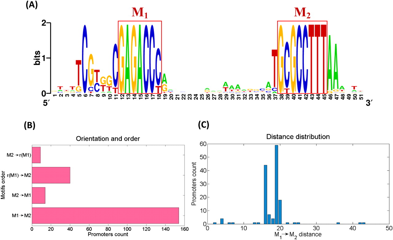 Properties of the motif pair (M1, M2). We refer only to occurrences in which the distance between the two motifs is <100. (A) Alignment of the 59 occurrences of M1 → M2 with gap length 19. The motifs are enclosed in red boxes. Several positions flanking the two motifs are conserved. In contrast, the gap between them is highly variable. The alignment for gap length 16 exhibits the same features (data not shown). (B) Number of occurrences of each of the possible arrangements of the two motifs. (C) The distribution of the distance between the two motifs for the M1 → M2 arrangement. The two motifs are almost always 16–20 bases apart. The graph shows all gaps of length 1–50; only four occurrences have a gap of length 51–99.