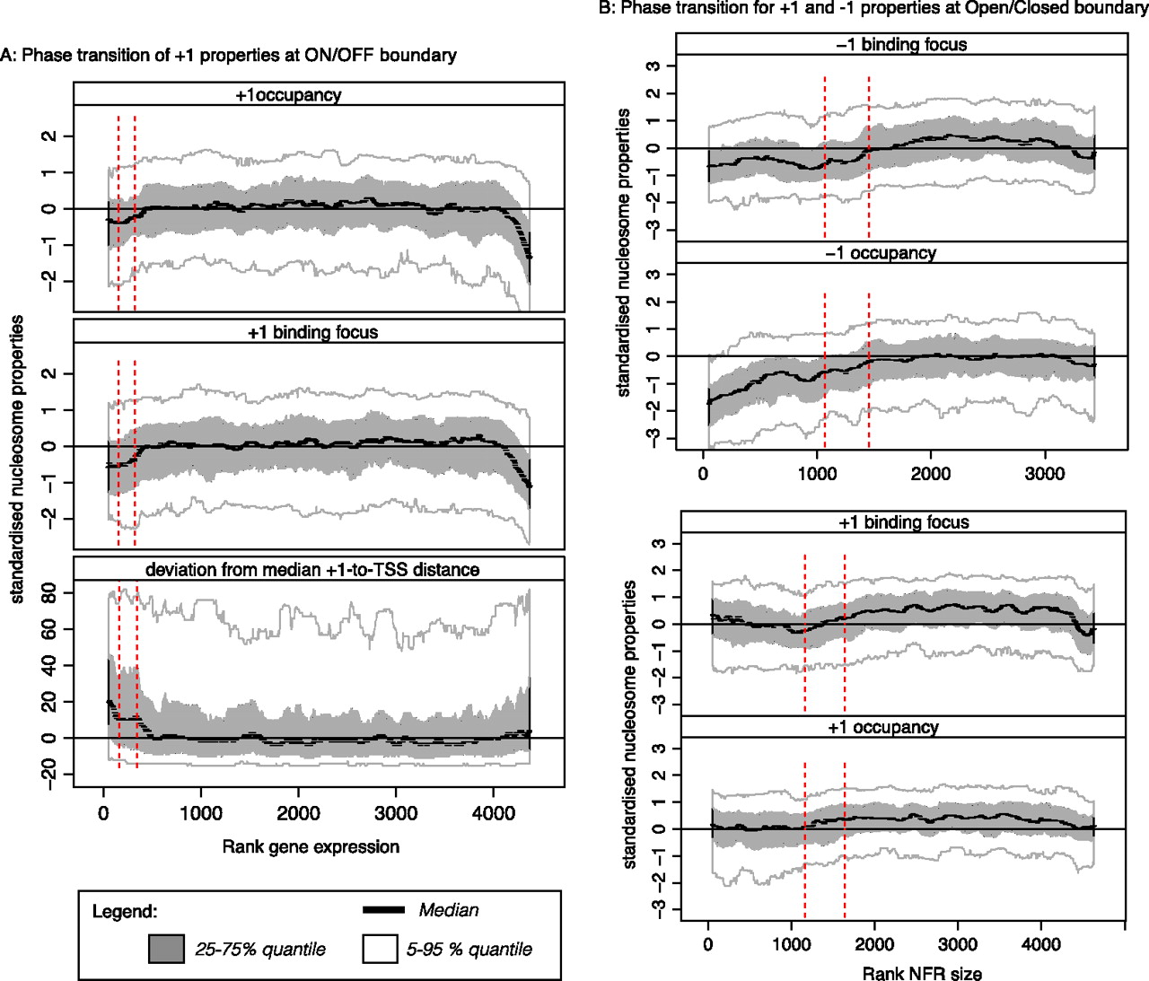 Phase transitions between promoter states. (A) Phase transition of +1 properties at ON/OFF boundary. The occupancy, binding focus, and the deviation from the median distance to the TSS (from top to bottom) for the +1 nucleosome are plotted against the rank of gene expression. The values were standardized and smoothed by a sliding window (window 200, step size 20). The median (black), 25%–75% quantiles (gray), and 5%–95% quantiles (white) are shown. A phase transition is observed at the boundary between ON an OFF genes. The red lines indicate the boundary for ON/OFF genes obtained from expression data with 1% and 5% FDR. The sudden fall in occupancy and focus toward the very highly expressed genes might suggest that nucleosomes get evicted upon very high expression. (B) Phase transition of +1 and −1 properties at Open/Closed boundary. The occupancy and focus for the +1 and −1 nucleosome are plotted against the rank of the NFR size. The values were standardized and smoothed by a sliding window, and the median (black dashed lines), 25%–75% quantiles (gray), and 5%–95% quantiles (white) are shown. A phase transition was observed for the −1 nucleosomes but not for the +1 nucleosomes. The red lines indicate the 60–90-bp window found in Figure 1A to mark the boundary between Open and Closed promoters.