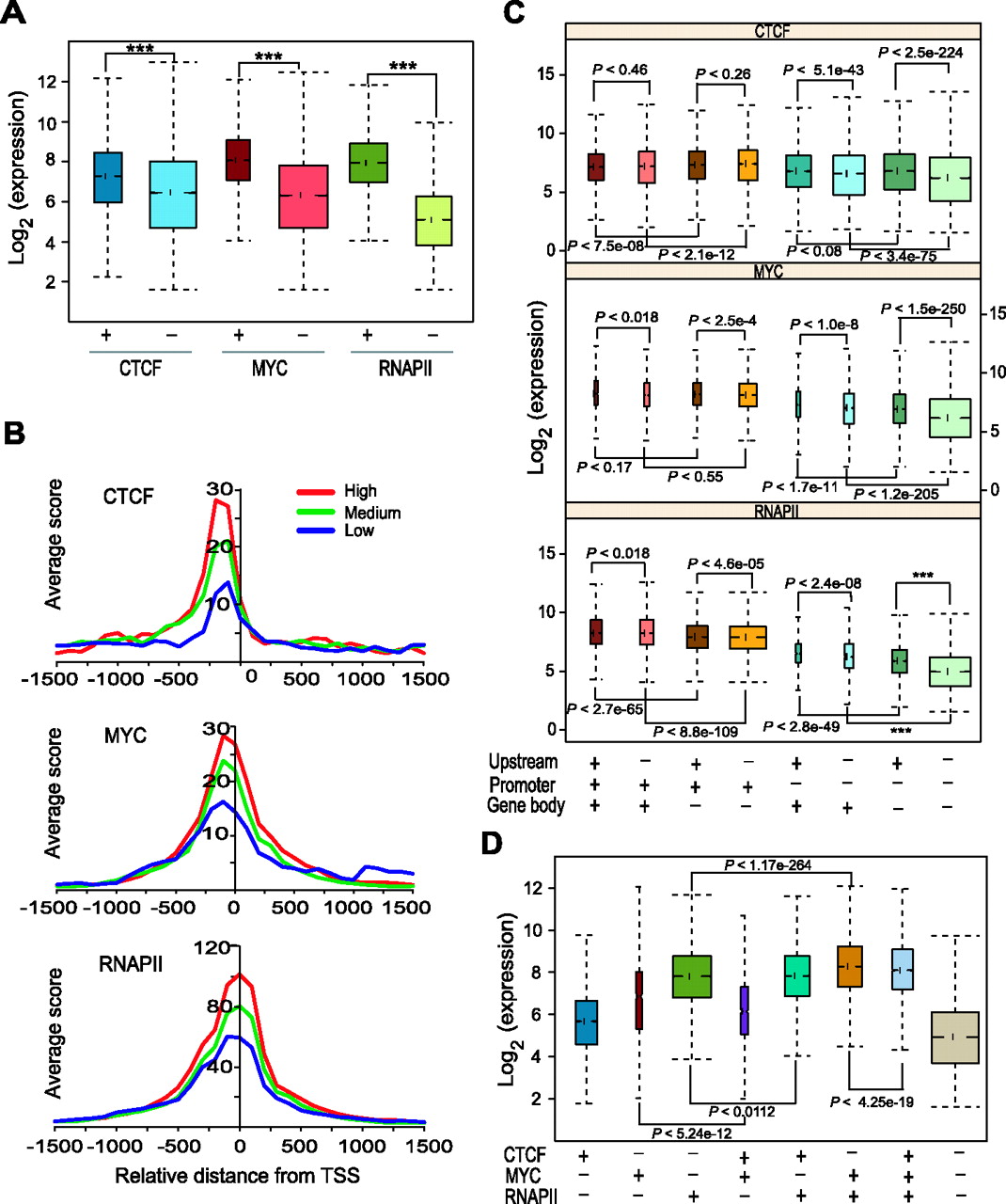 CTCF, MYC, or RNAPII binding is associated with activated expression of their target genes. (A) Boxplots show that genes downstream from promoters (within ±2 kb from TSS) bound by any one of the three factors have significantly higher expression than genes not occupied by them. Data shown are across all cell types. Groups along the x-axis indicate promoters either occupied (+) or not occupied (−) by the indicated TF. The y-axis shows transcript expression levels. P-values were calculated by Wilcoxon rank sum test. Three asterisks (***) indicate a P-value of zero. (B) TSS profiles of CTCF, MYC, and RNAPII binding in K562 cells over genes with different expression levels. Genes were divided into three different expression groups based on their expression level in K562 cells as top 33% (High), middle 33% (Medium), bottom 33% (Low). The y-axis indicates average ChIP-seq score. (C) Boxplots show distribution of gene expression levels of genes bound by TFs in three different genomic regions: promoters, upstream, and gene body. Occupancy of each factor in the indicated genomic location is shown as + (presence) and − (absence) at the bottom. The y-axis shows the log-transformed expression level of genes. Data shown are across all cell types. P-values were calculated by Wilcoxon rank sum test. (D) Boxplots show expression of genes with single and combinatorial binding of the three TFs across all cell types. Combinatorial binding of MYC and RNAPII enhances their target gene expression. The x-axis represents single-factor-bound or multi-factor-bound gene groups. Occupancy of each factor was shown as + (presence) and − (absence) at the bottom. The y-axis shows the log-transformed expression level of genes.