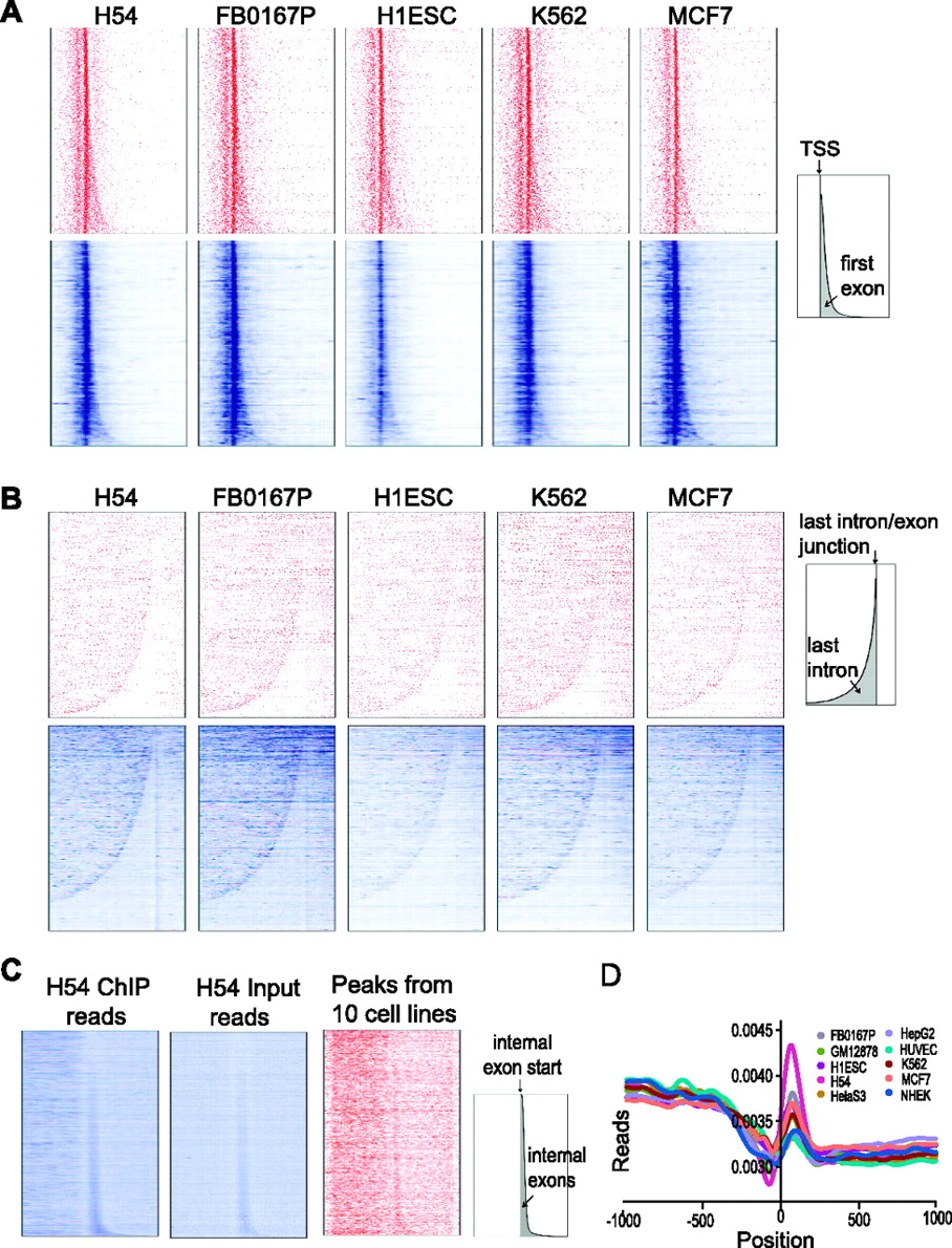 RNAPII is enriched in exons. (A) Heat maps of gene-wise RNAPII occupancy. RNAPII signals in the form of input-corrected peak scores (red) or read counts (blue) were assigned to 10-bp bins across the 4-kb region shown in these plots (1 kb upstream of and 3 kb downstream from the TSS). Only genes with at least one peak or read occurrences within 4 kb of their TSS are plotted. As a result, the plotted gene sets in the top row (red) are different from that in the bottom row (blue). Five representative cell lines are shown and data for additional cell lines are in Supplemental Figure S20. The schematic at the right shows the overall gene map, with the first exon area shaded in gray. (B) RNAPII occupancy is higher in the last exon compared to the last intron. Heat maps similar to A, but genes were aligned by the start of their last exons and sorted by the length of their last introns. RNAPII signal across the 9-kb region (7 kb upstream of and 2 kb downstream from the start of the last exon) is represented similarly as in A. Most of the long genes at the bottom of the read plots (blue) do not have significant RNAPII binding and therefore are not part of the peak plots (red), a phenomenon contributing to the pattern difference between read plots and peak plots. (C) RNAPII is enriched on internal exons. Internal constitutively spliced exons were aligned by their start and sorted by exon length. RNAPII occupancy 1.5 kb upstream of and downstream from the exon start sites is plotted. In the representative H54 cell type shown, reads for both RNAPII ChIP and input showed stronger intensity within internal exons (first two panels, blue). However, the combined RNAPII peaks (input-corrected and normalized) from all 10 cell types showed modest enrichment at internal exons (third panel, red). (D) Read profiles for RNAPII ChIP-seq, after correcting for input signal using our binomial correction method. Zero indicates the start (5′ end) of constitutive internal exons.