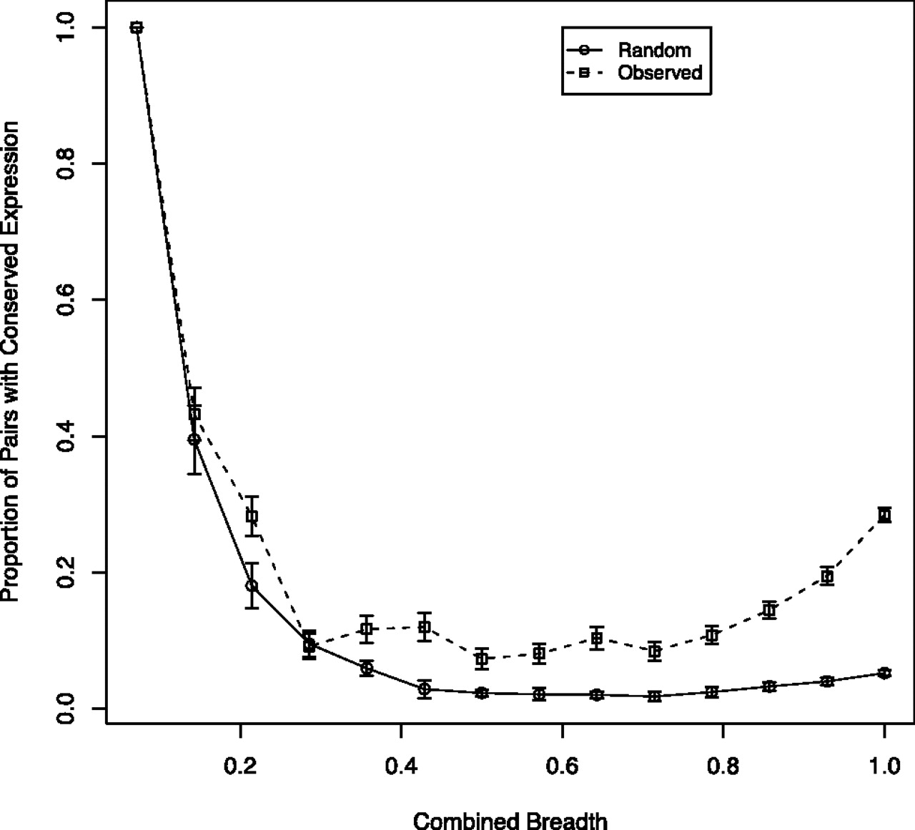 The proportion of Salicoid duplicate genes with conserved expression plotted against the combined breadth of the two duplicate genes for the observed and random distributions. Conserved expression was defined as a Spearman expression distance less than 0.3, which corresponded to the lower 5% cutoff of expression distances for permuted genes. Error bars denote the standard error obtained by 1000 bootstrap replicates.